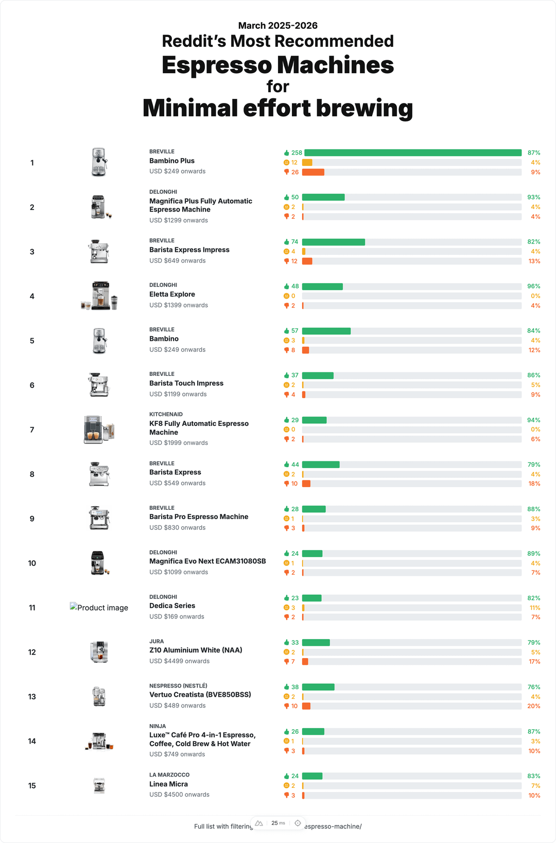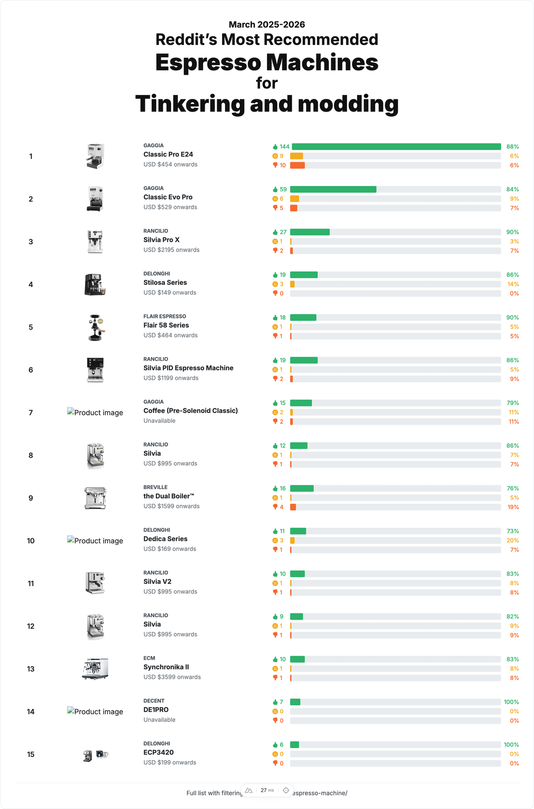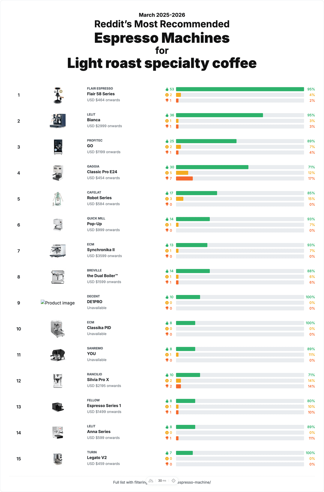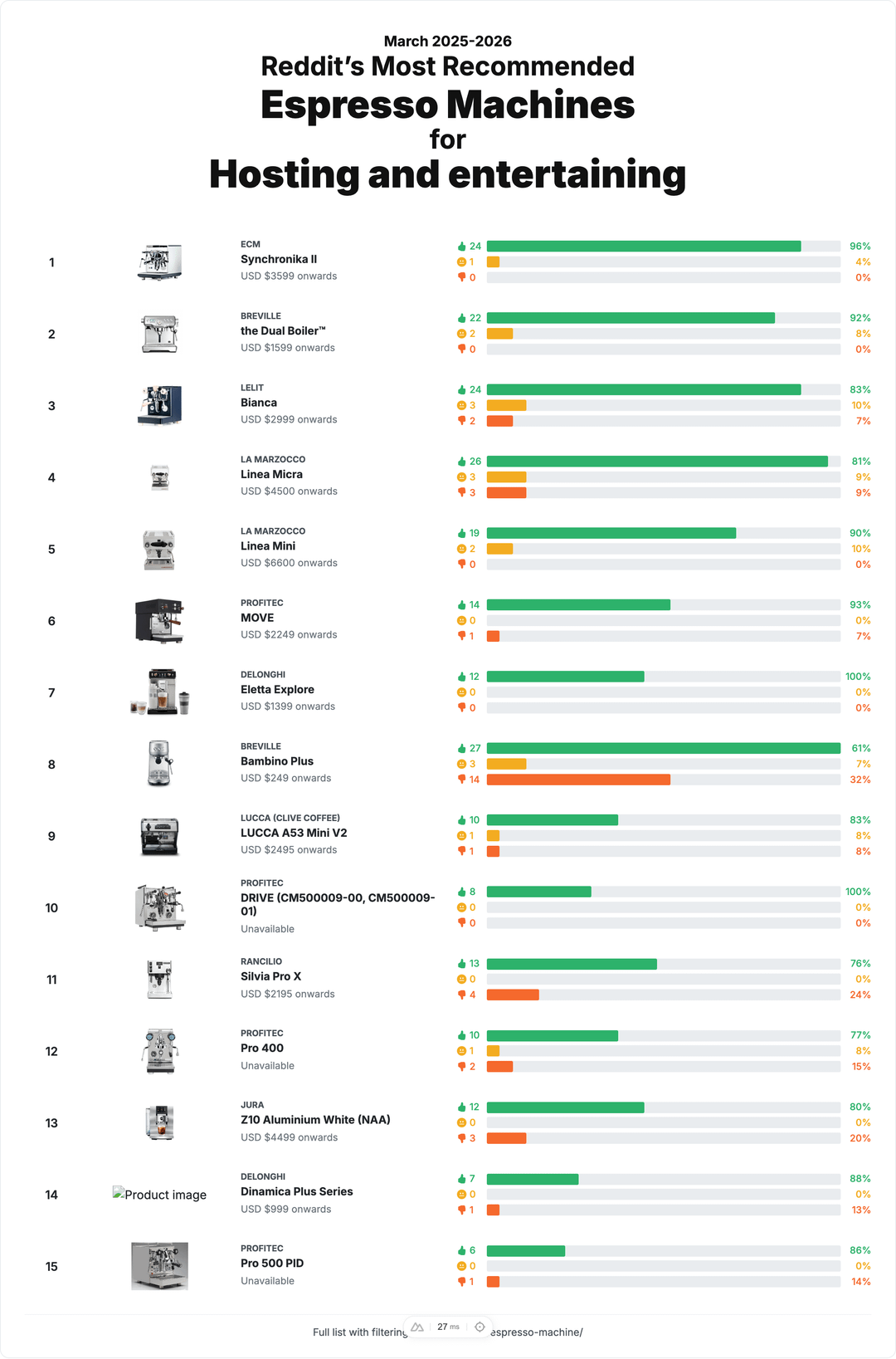 Was doing some analysis on Reddit data and looked into espresso machines. Thought I’d share the results.