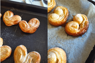 Preparing the palmiers -> Take the puff pastry and use a rolling pin to roll it out into a rectangle about 4-5 millimeters thick. Sprinkle the surface generously with sugar and gently press it down with the rolling pin. Roll or fold the two ends to the center and cut the “roll” into slices about 2-3 centimeters thick. Arrange the palmiers on a baking sheet lined with parchment paper, spacing them apart, sprinkle with more sugar, and bake in a preheated oven at 190°C (375°F) for about 20 minutes, until golden brown.