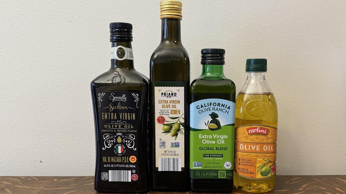 Four bottles of olive oil against white background – Sophie Morelli / Food Republic