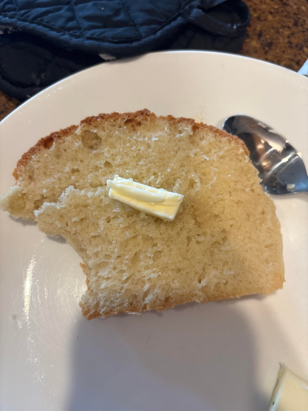 No knead bread tends to come out looking like this, just a little unfinished compared to a kneaded bread. Yours looks good, crumb looks good too. Again, all the no knead bread I’ve done tends to have a tighter crumb like this. Did you enjoy it? Was it good with butter and jam? If so, you got a tasty loaf that looks pretty good! I’d call that success!