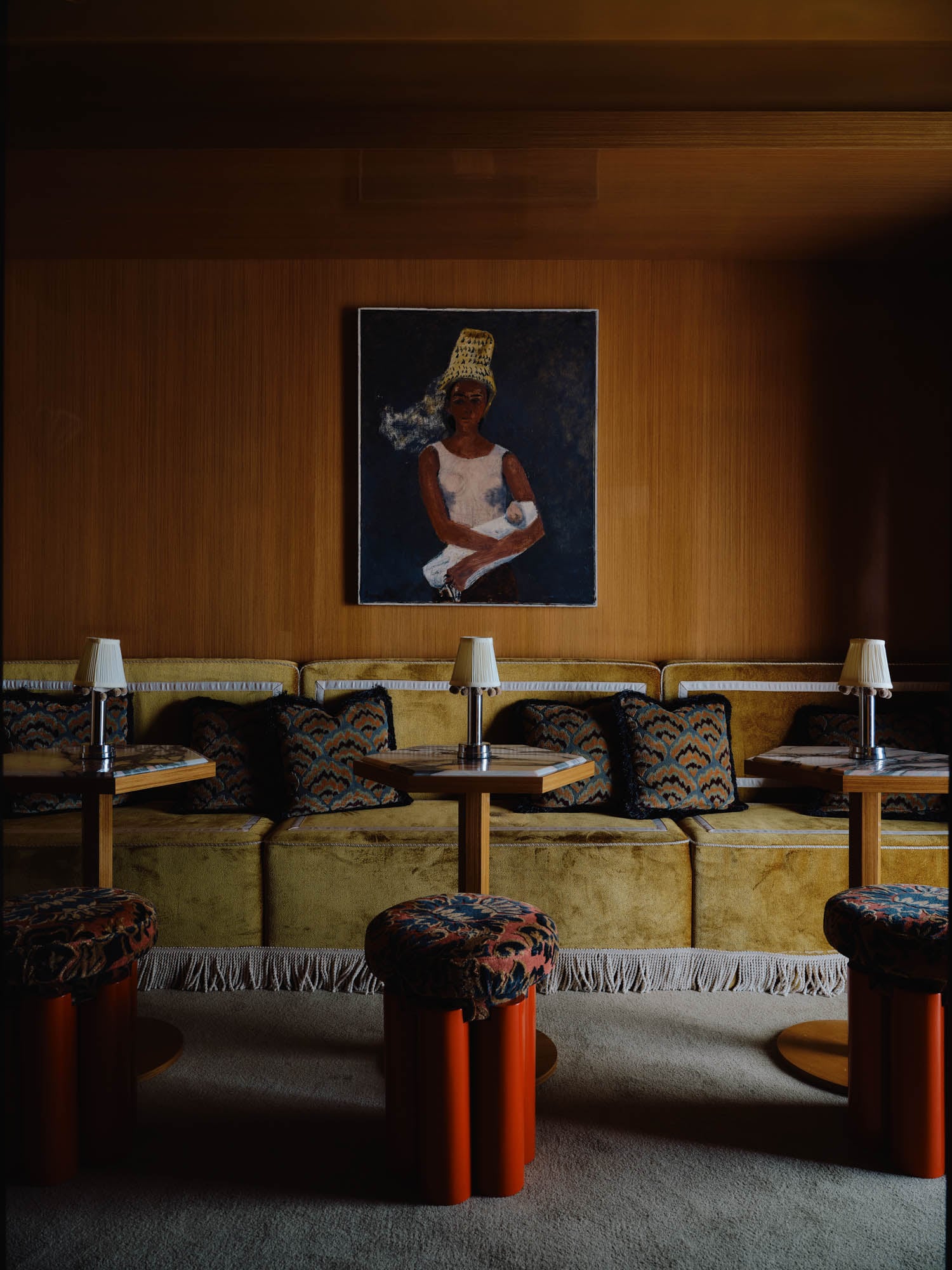 “By combining dusty rose, warm ivory, moss green, and muted gold with the richer, moodier salon hues, we created a layered visual experience that unfolds gradually—like a memory or a quiet performance,” Tu says. “The colors invite guests to slow down, linger, and fully immerse themselves in the space.”