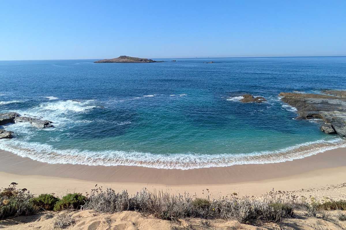 The following day, we arrive in the coastal town of Porto Covo. We peruse the local market, where elders sell fresh, homegrown produce and snacks, including moreish roasted in-shell almonds and tremoços (a snack food of cured lupin seeds). Afterwards, we head towards the sea to walk a small portion of the Fisherman’s Trail hike, which trails down the southwest coast of Portugal and would take multiple days to complete in full. The route we take sees us navigate the rugged cliffs and eventually work our way down to the sand, where we discard our trainers and socks, and most of our group take a dip in the clear water.