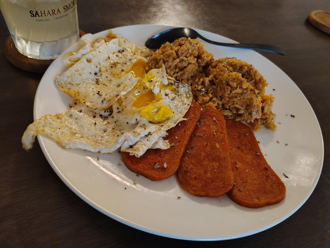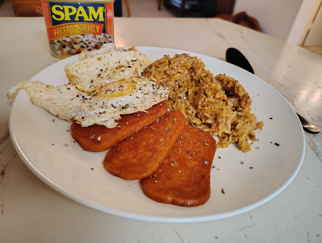 Hot & spicy spam, broccoli cheddar rice, eggs over easy
