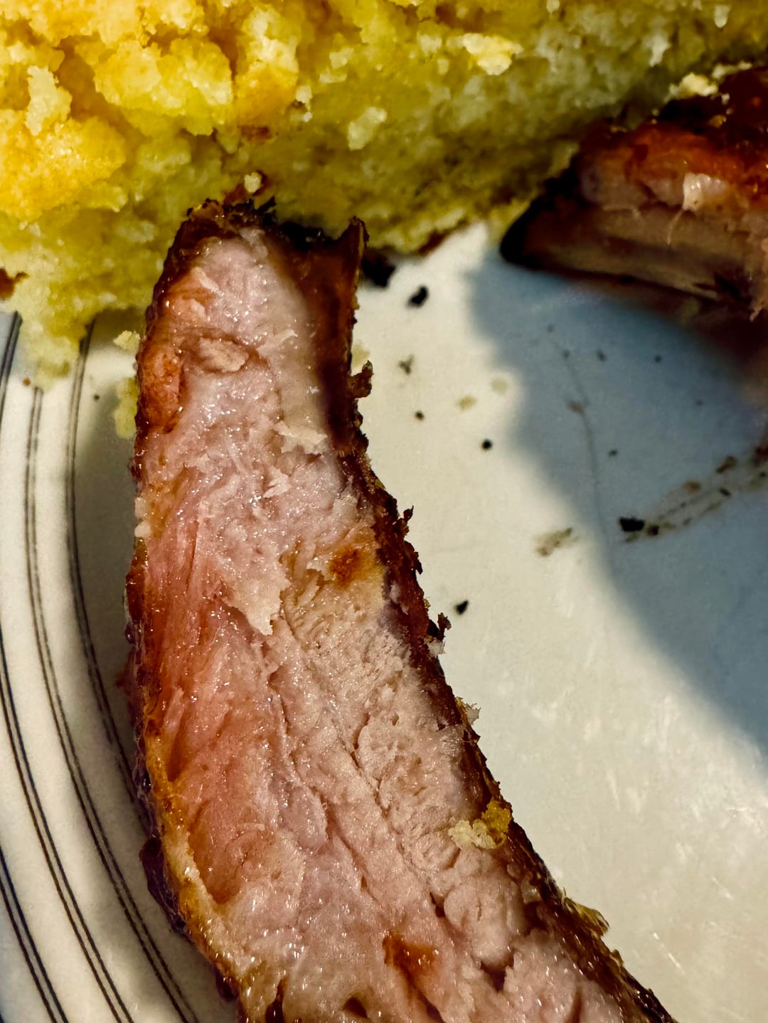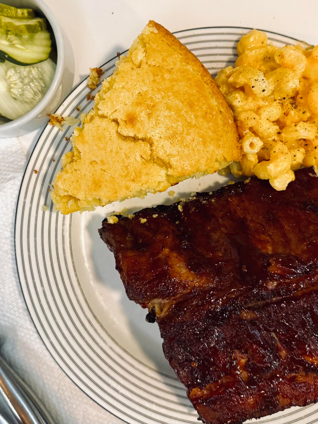 Baby back ribs 165 for 12 hours, finished on gas grill. Simple corn bread recipe in cast iron. Sam’s Club Mac and cheese lol.