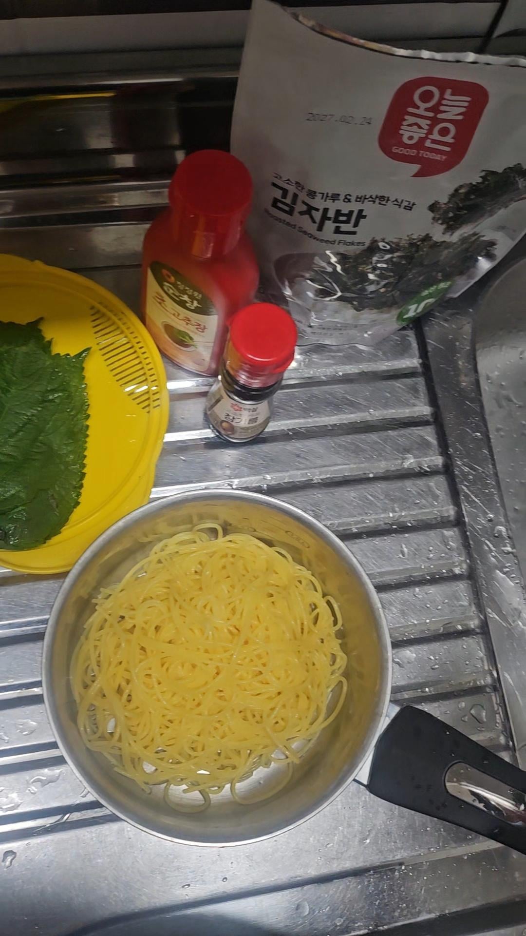 Simple homemade bibim noodles with corn noodles. Chewier than regular thin noodles, but not as chewy as cold chewy noodles. With perilla leaves and seaweed for a light meal.