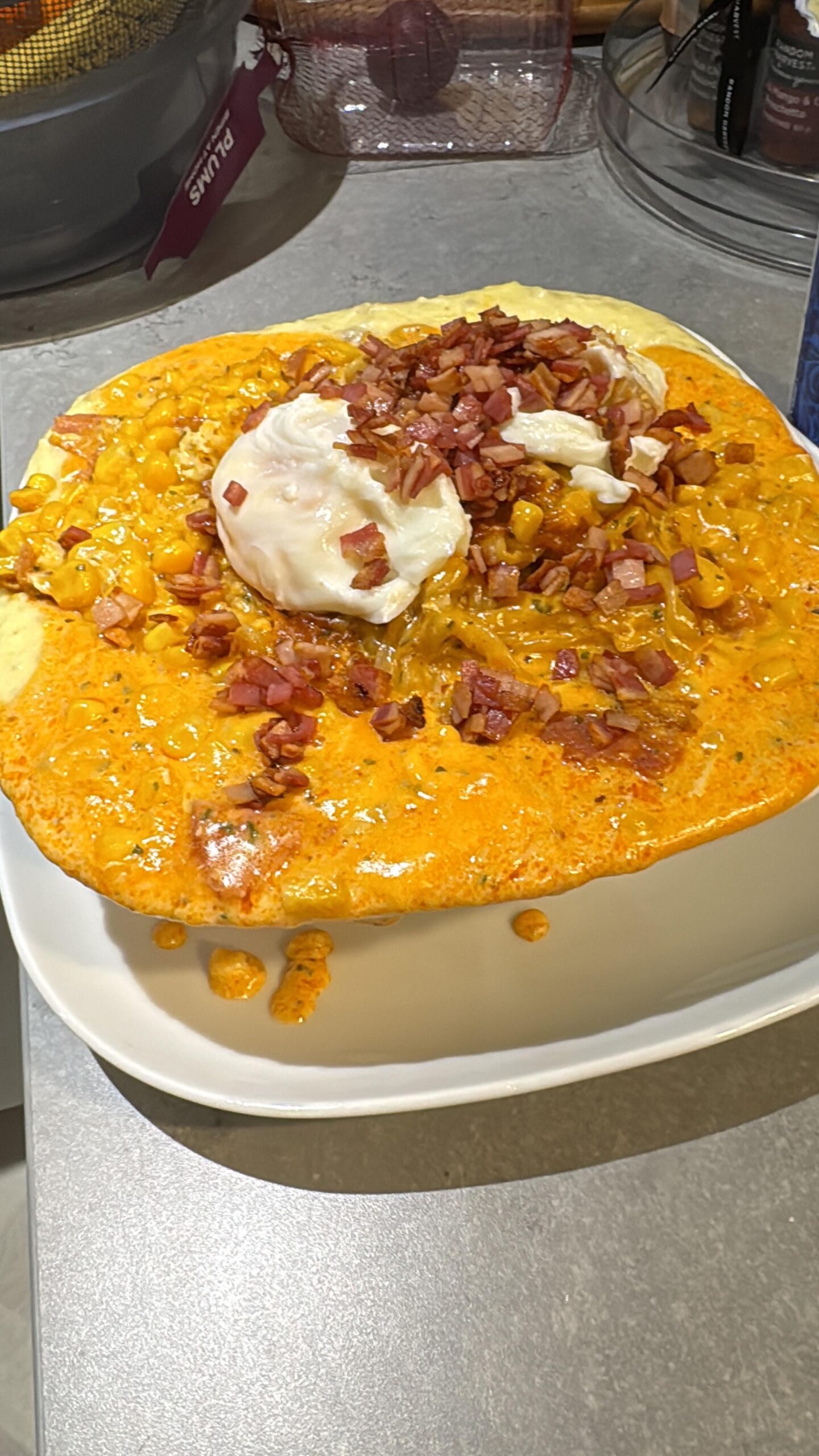 Behold. Mashed potato’s on the bottom, Buldak Carbonara noodles with a cup of double cream added, mozzarella and corn and mayo fried to melting added on top. Beef salami thrown in, turkey rashers fried and cut on top. Two poched eggs, parsley and two slices of American cheese melted over the top .