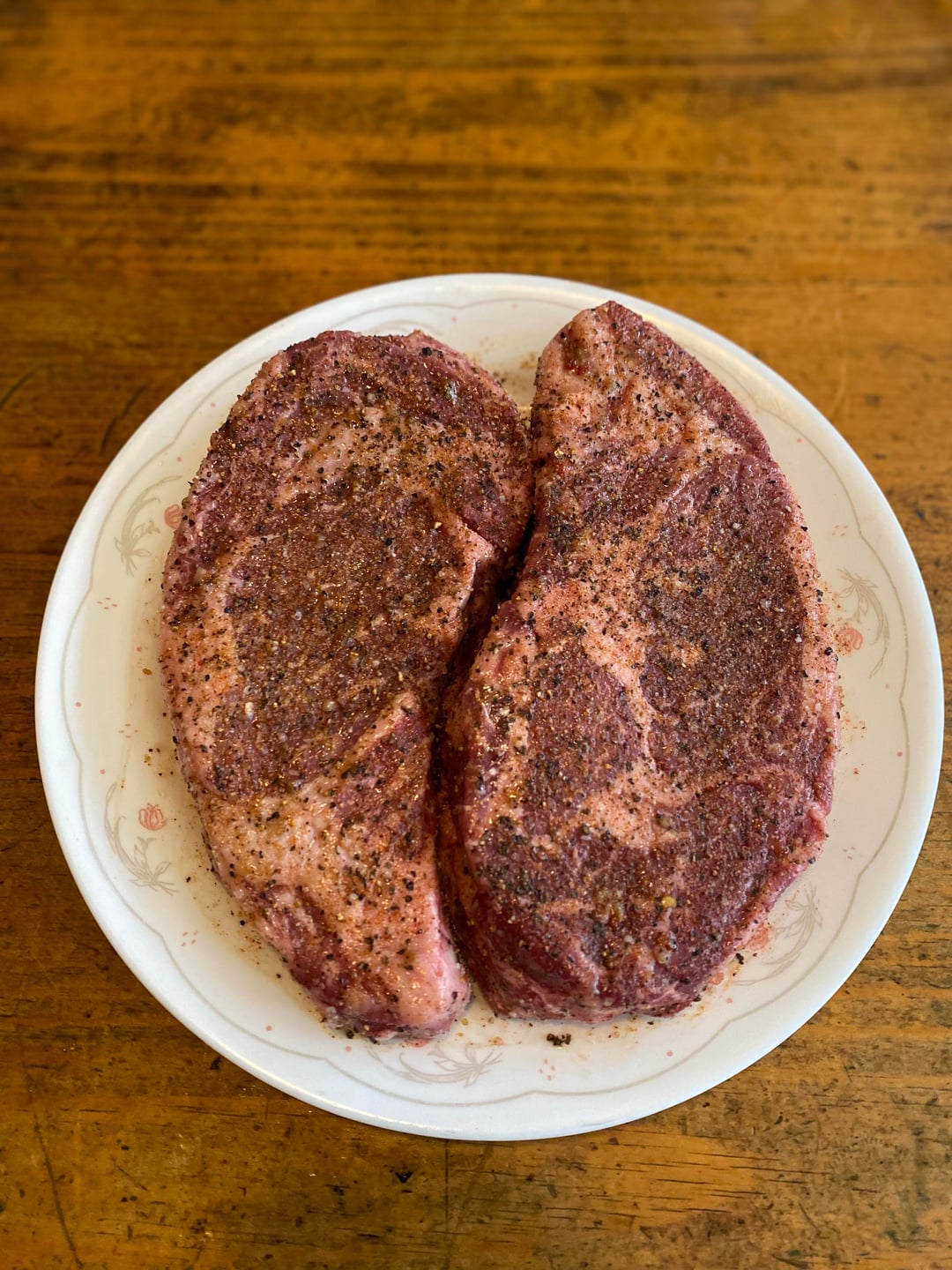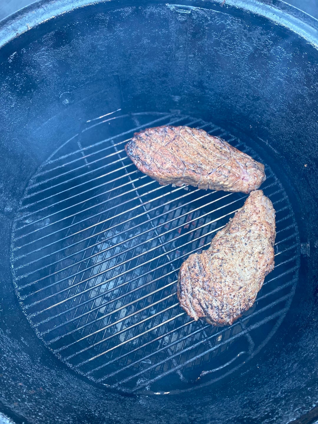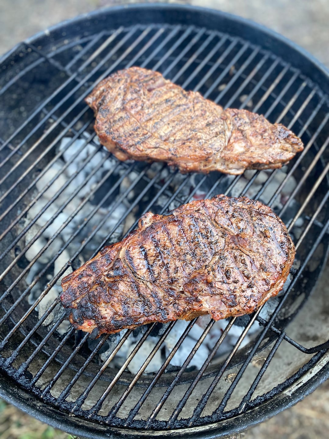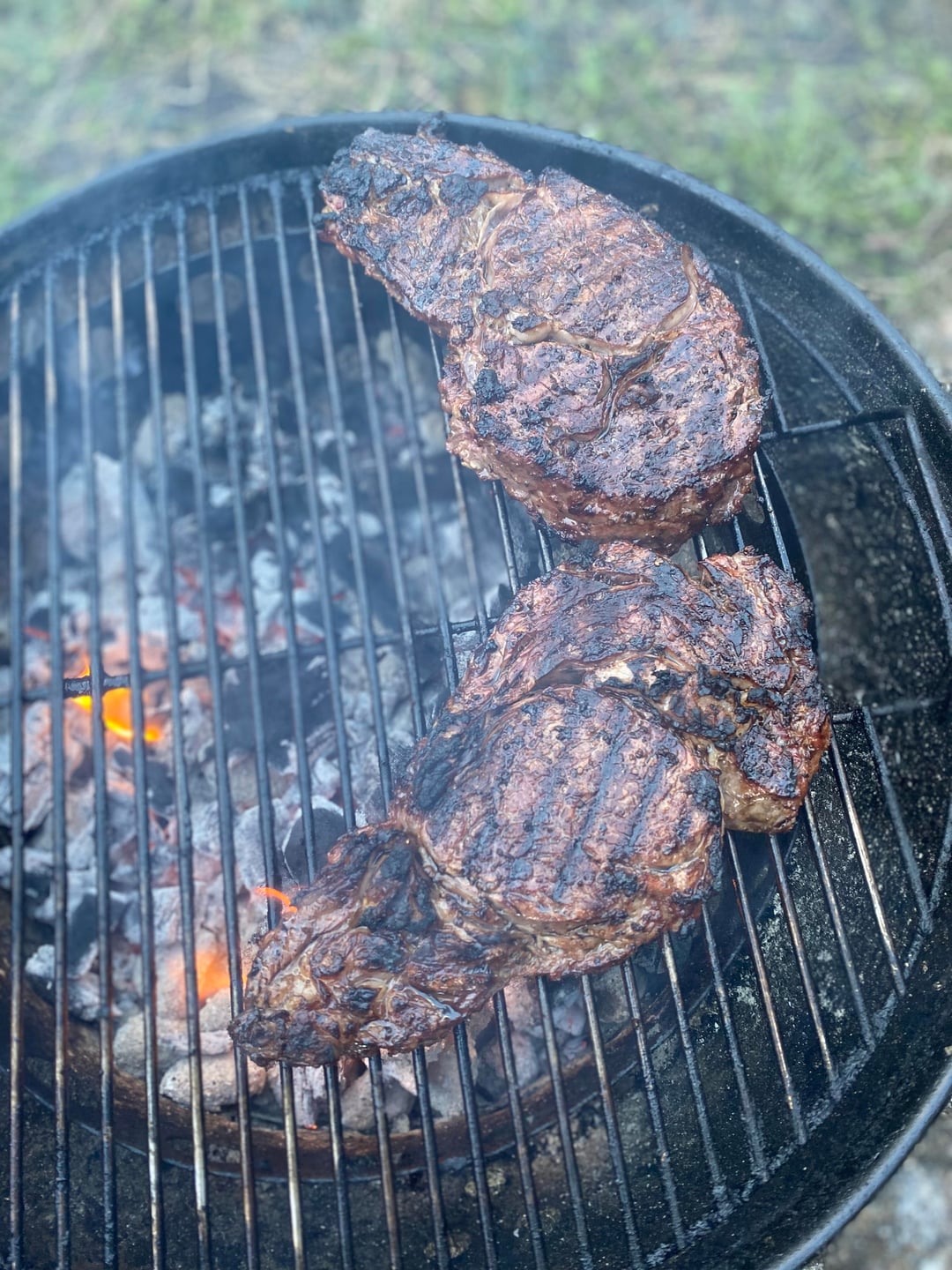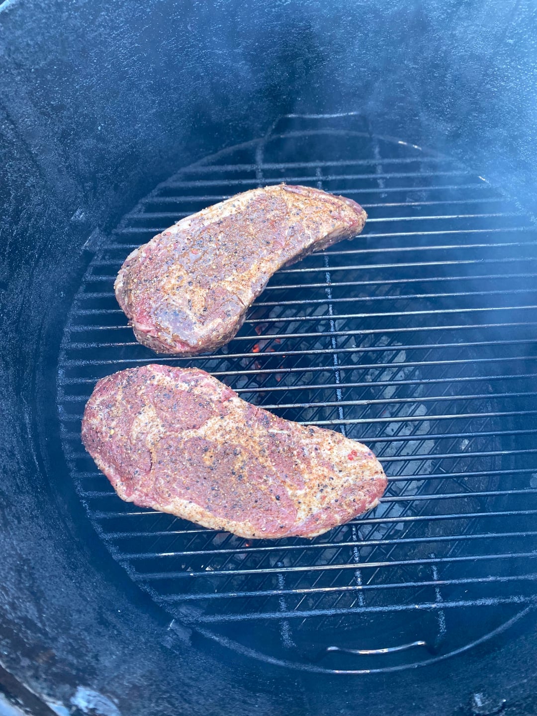 I started by seasoning the ribeyes with olive oil & my steak seasoning I make consisting of salt, #10 & #16 mesh black pepper, garlic powder, season salt, raw sugar, jalapeño powder, celery seed, sumac, & arbol pepper. I cooked the steaks using a blend of lump charcoal & mesquite wood starting on the middle rack of my “Weber Smokey Mountain” smoker at 350F for the first 16 minutes of the cook, flipping once. Then I placed the steaks on the fire box right over the coals flipping the steaks every 3-4 minutes ensuring a nice crust without burning until the steaks were around 131F degrees internal temperature (how I like my ribeye cooked). The last picture is the steak with red skin mashed potatoes & red wine gravy.