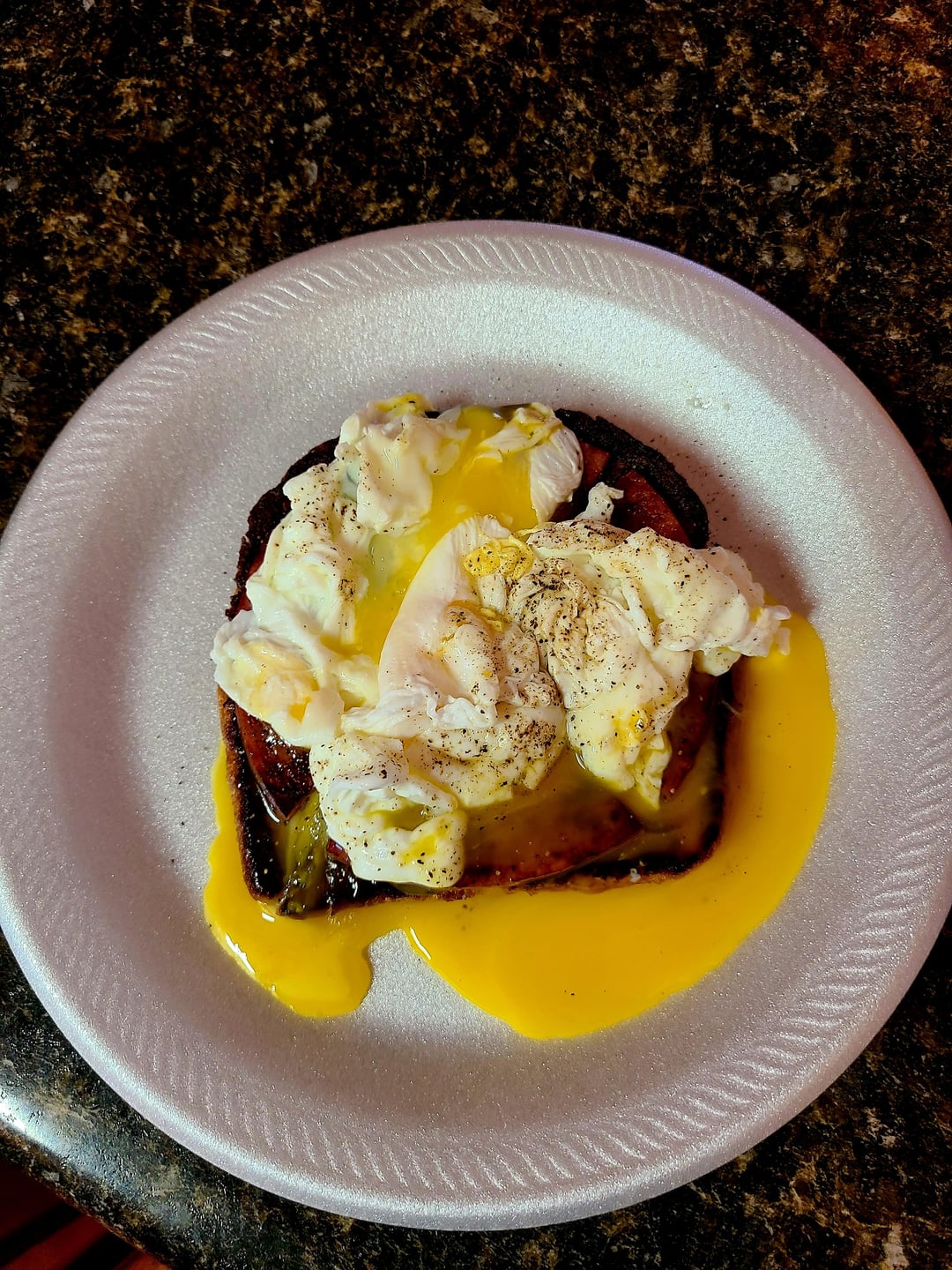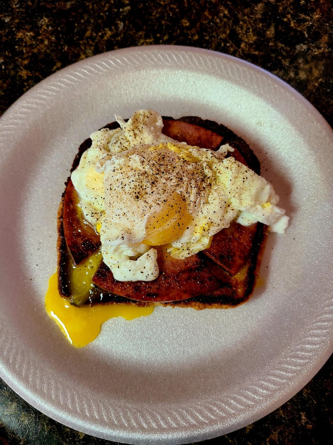 So you have that, then a fried piece of bologna, then poached eggs 😁