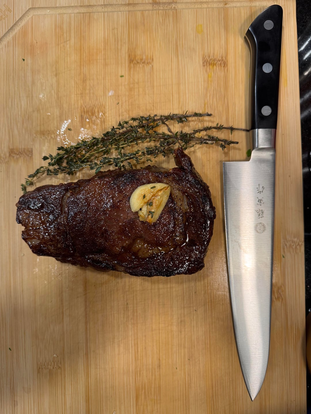 It was seared for 20 seconds each side and basted with butter garlic and thyme for another 20 seconds.