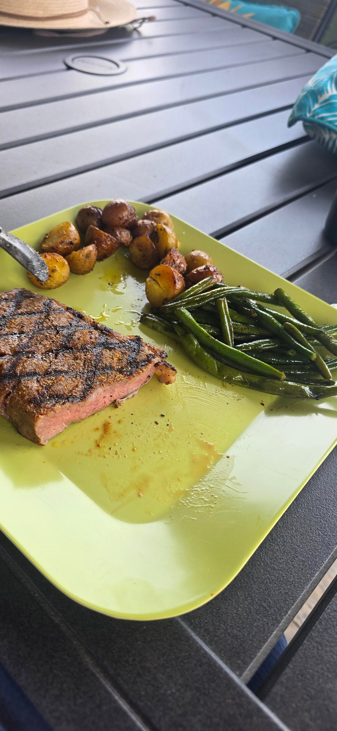 New York Strip, cooked at 132 for 2.5 hrs, then seared with roasted potatoes and sauté green beans.