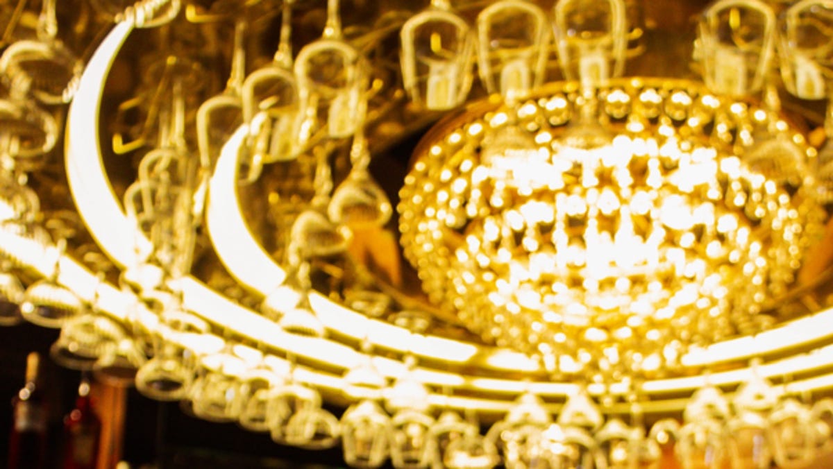 A highlight of the space is its chandelier above the bar that is surrounded by a wine glass rack.