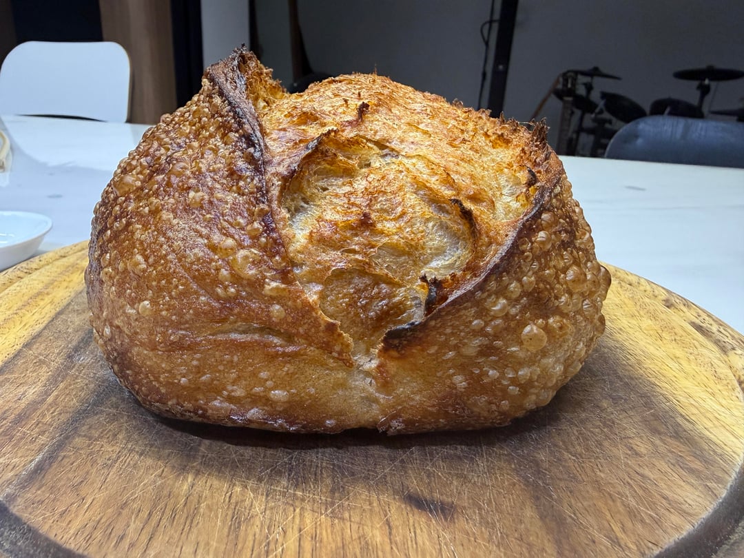 Steps: fermentolyse. Do stretch and fold 2x every 30 mins. Then coil fold at 1.5hrs. Followed by another coil fold at 3hrs. Bulk for another 2 hours until dough is double and poofy and pillowy. Shape and fridge overnight for 9 hours. Bake at 230c for 22 mins and 210c for 20 mins.