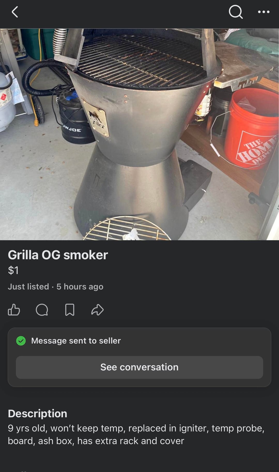 I just happen apon a marketplace score. Grilla grill OG, seller stated it wouldn't keep temperature and she was tired of buying parts for it. Price—-FREE. Brought it home, cleaned it out. The Ash pit was completely full. Fired it up ran it at 300 for 30 minutes and she ran like a dream. I checked the receipt it's only 5 years old just needed some love.