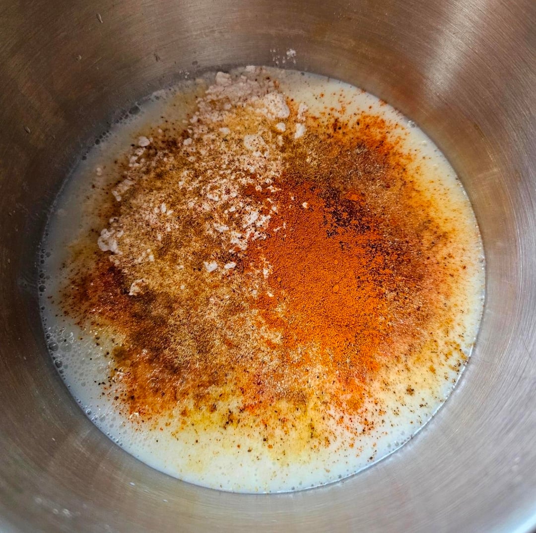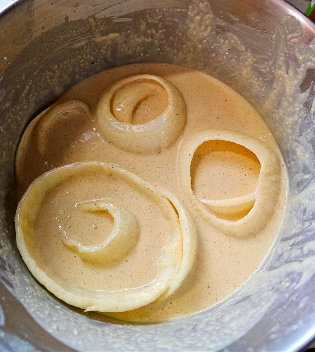 Mix butter milk, flour, cornmeal, salt, pepper, garlic powder, paprika, cumin, tumeric, and if you want a little kick add chili powder, then soak the regular rings.