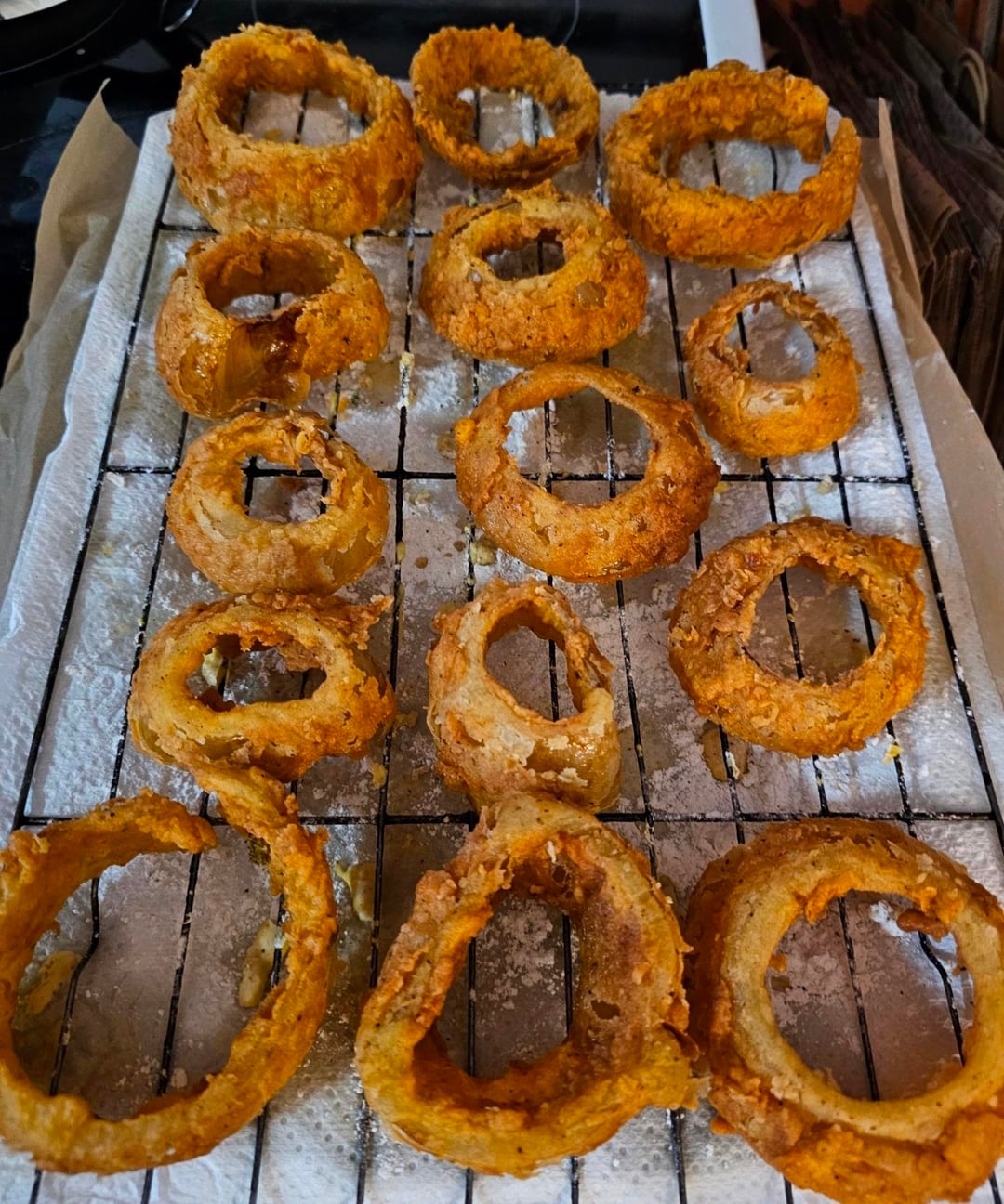 Mix 2:1 flour:cornstarch & SPPOG then coat the stuffed rings, add a little of the buttermilk batter and mix until chunky then coat all of the regular rings (this gets them out of the bowl), dip the stuffed rings in the wet batter, then the dry flour mix, and rack them to let them dry out before frying while preheating the oven to 375°