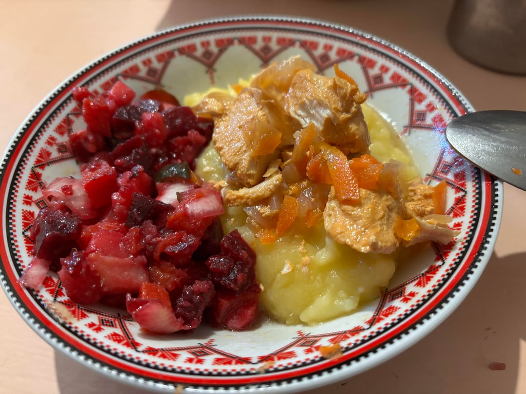 Today’s lunch in my military unit somewhere in Ukraine: solyanka soup, mashed potatoes with meat and vegetable stew, and vinaigrette salad