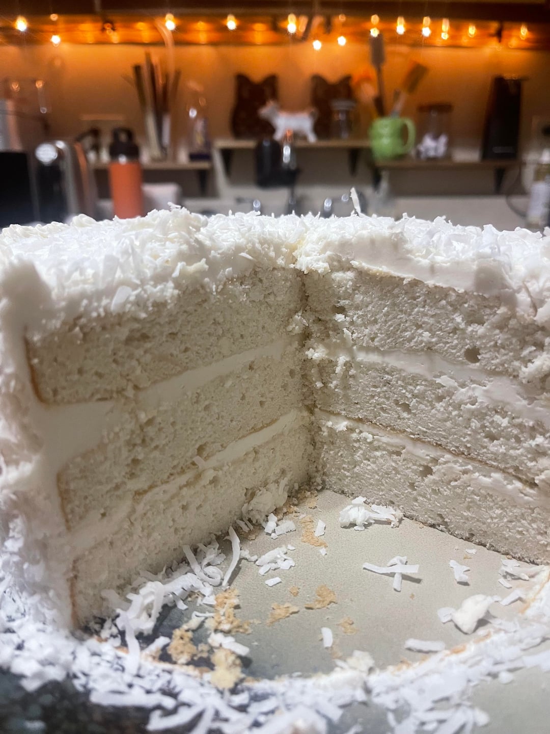 My daughter requested a coconut cake for her 14th birthday. I have never made this kind of cake before but have eaten several throughout my life. Was kinda grateful for her choice because shredded coconut is great at hiding decorating issues and my piping leaves much to be desired lol. I am not a cake baker, I tend to focus on cookies and cupcakes. Aside from leveling the cakes better, any recommendations to make any future layer cakes better?