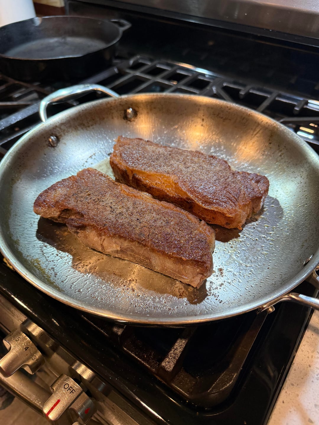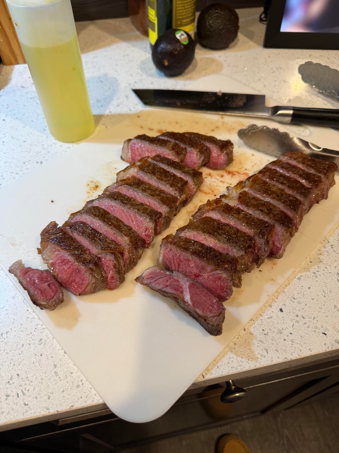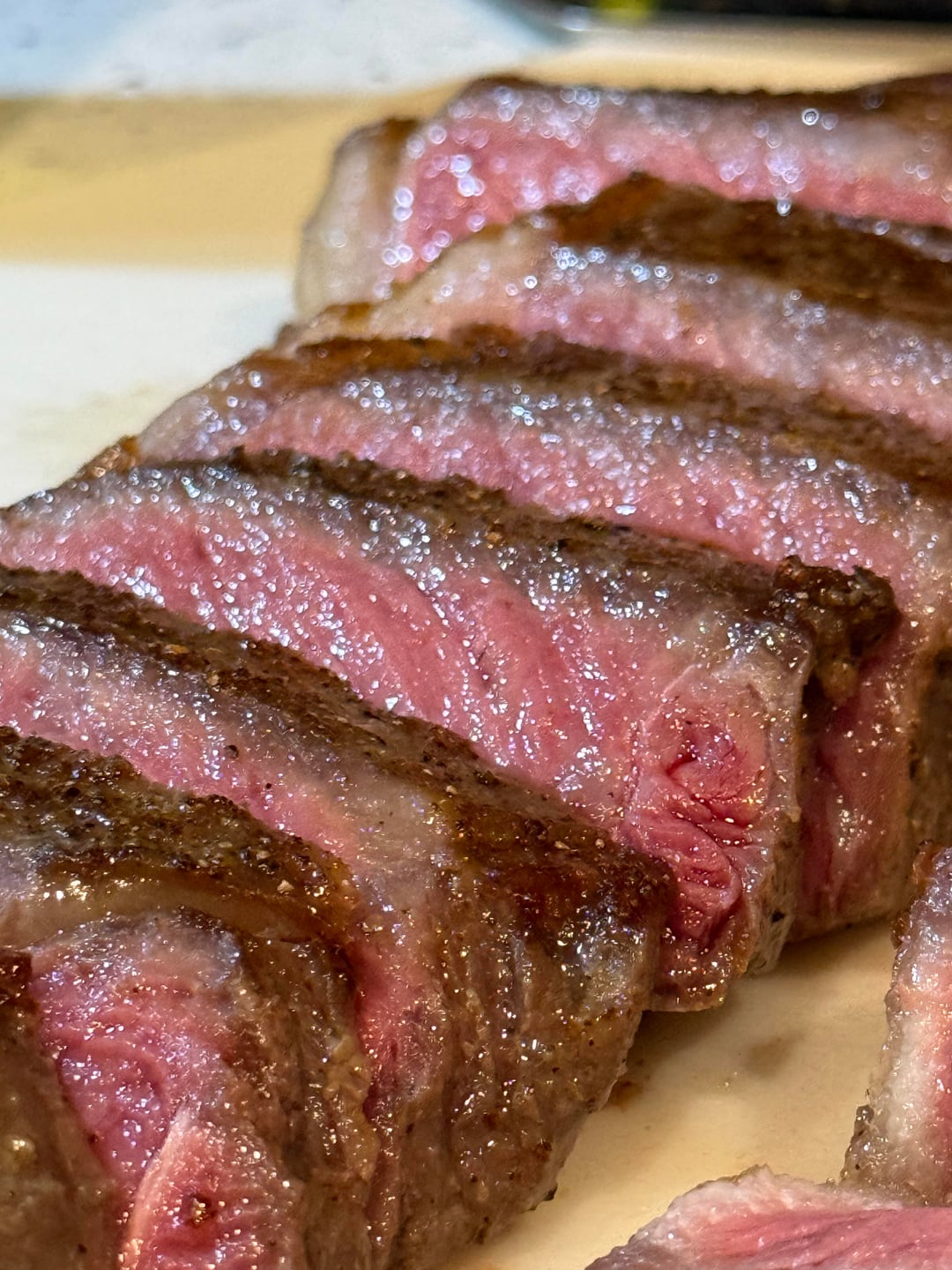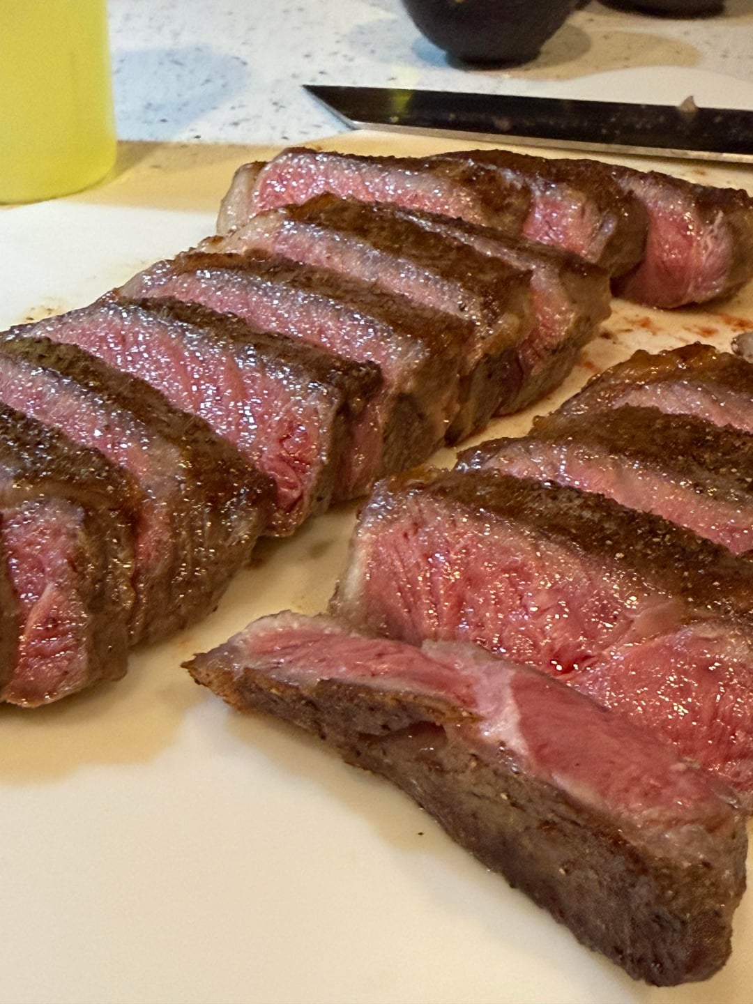 129* for an hour and a half -> ice cold bath in the bag for 20 mins -> pat steak dry as the desert -> pan hot with a little oil -> sear each side for ~1min -> butter baste with garlic and boom