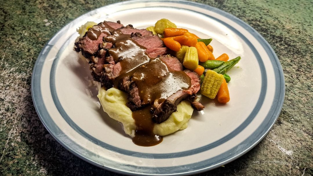 Afterward, I gave it a 10-minute ice bath and patted it completely dry. The crust actually stayed completely intact. I just gave it a screaming hot, fast sear to blister the fat. For the sauce, I made a quick roux and whisked in all the leftover bag juices for a pan gravy, and served it with some mashed potatoes and veg. Really happy with how the crust held up!