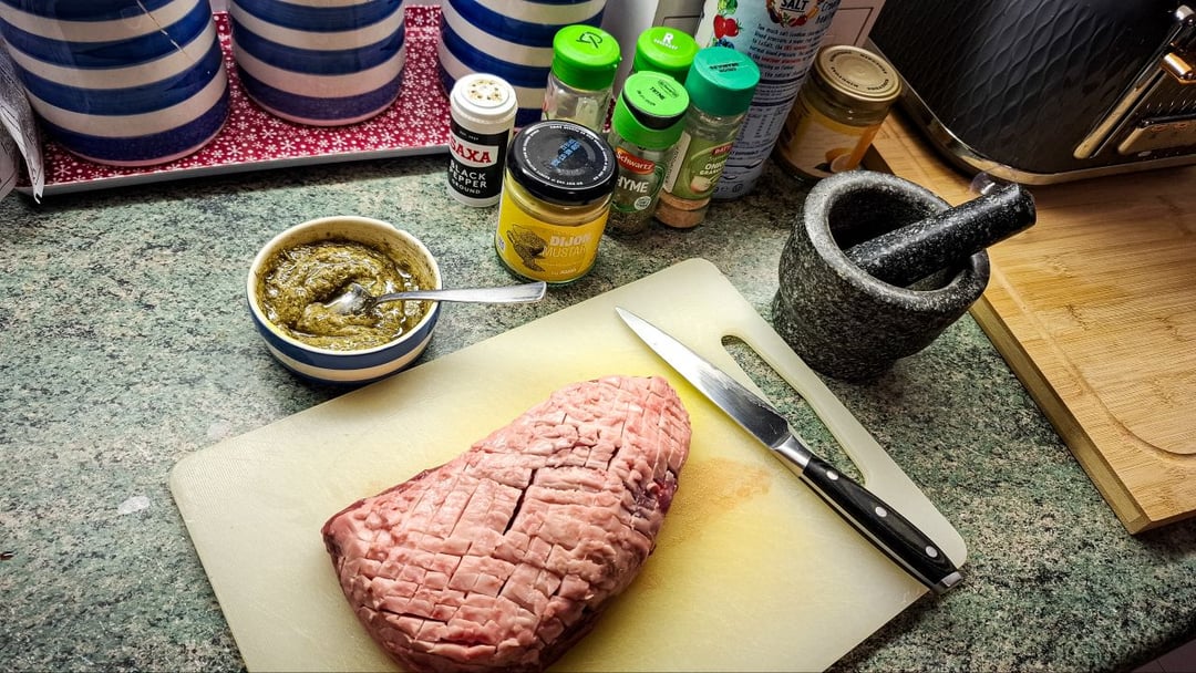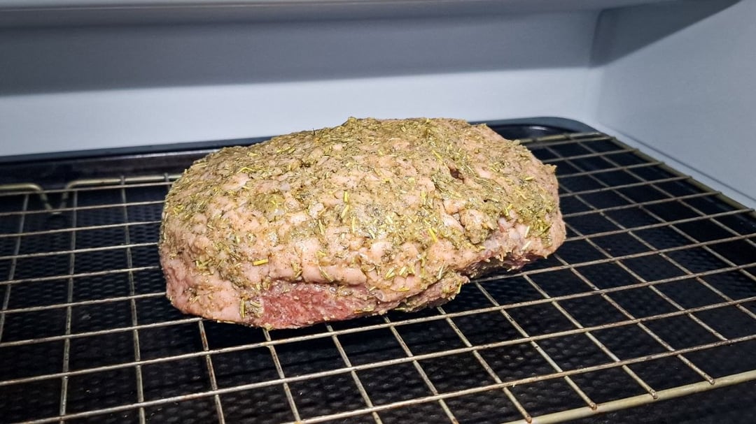 I wanted to see if a wet paste would actually hold up in the bag and form a solid crust. I scored the fat cap and rubbed the lamb with a thick paste made of Dijon mustard (as a binder), olive oil, salt, black pepper, dried rosemary, thyme, garlic granules, and onion granules. The trick was leaving it uncovered on a wire rack in the fridge overnight. The cold air dried the mustard and oil into a tacky pellicle, which locked the herbs onto the meat.