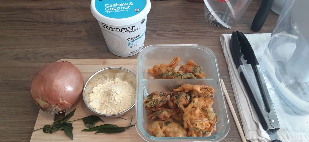 Recipe by Chetna's mum, I used Forager vegan yogurt and leftover pakoras from last week. They freeze well, but if you're using frozen pakoras, thaw them in the fridge overnight before crisping them up in the air fryer.