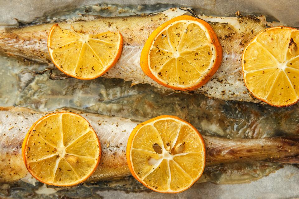 Remove the fish from the marinade an place into a lightly greased baking pan. Top each fillet with a couple orange slices. Cover with foil and bake in a preheated 350-degree F oven for about 20 minutes, or until fish is cooked through.