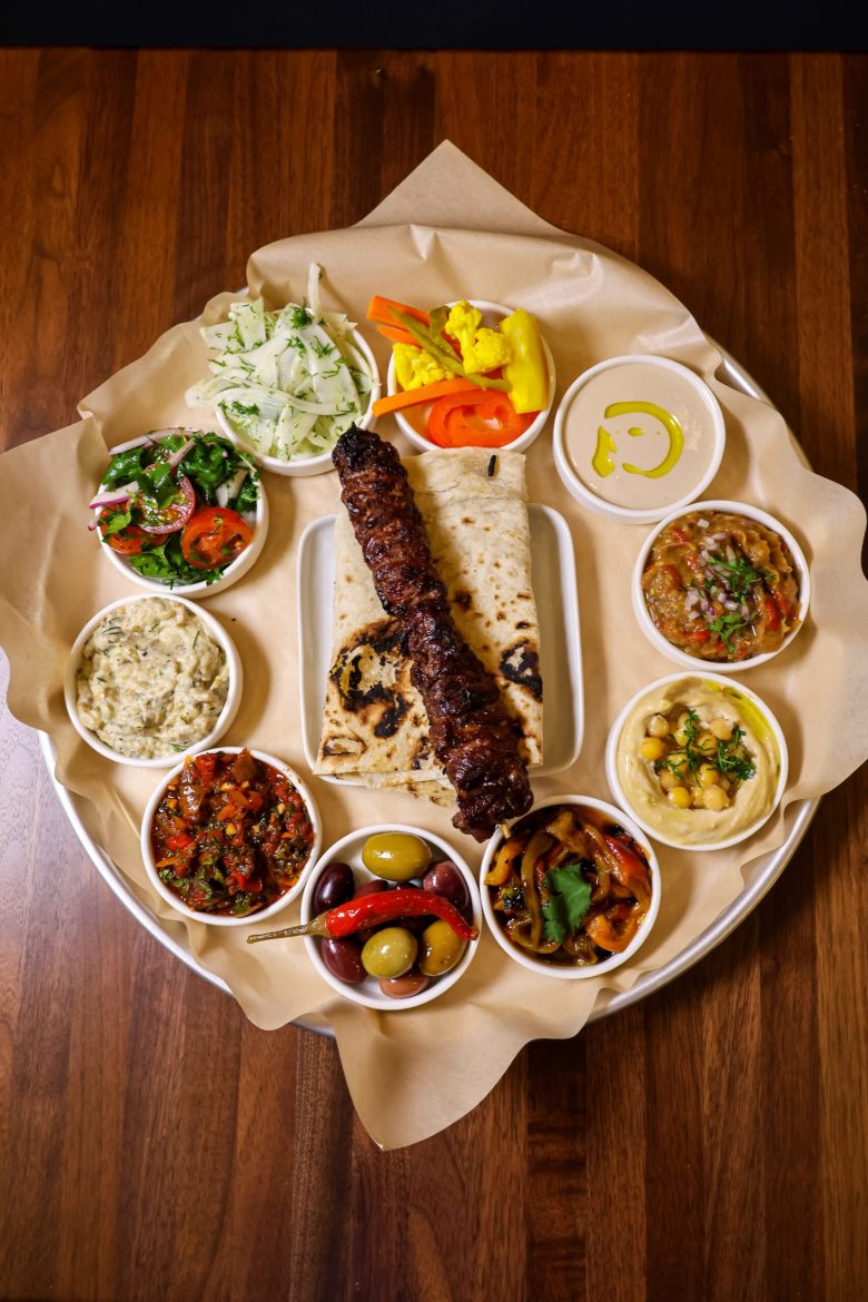 Meet & Meat’s bottomless salatim is $25 per person and includes all of the restaurant’s house-made salads and dips, plus a grilled skewer and laffa bread. The dips and salads can be refilled as much as desired, while additional skewers can be added for $8-9 each.