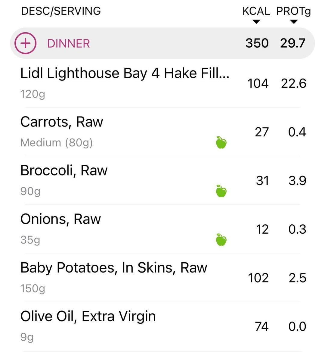 Hake, stir fried veg & smashed baby potatoes – 350 cal, 29g protein.
