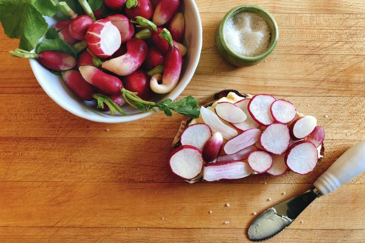 If using globe radishes, in addition to trimming the tops as you did for the breakfast radishes, cut a slit into the four sides of the radish with a paring knife. Soak them in ice water for about 30 minutes to crisp up and bloom a bit before serving. You can also simply cut an “X” in the bottom of the radish to hold the butter and salt. Smear with butter first and then dip into the salt. Pop into your mouth and enjoy!
