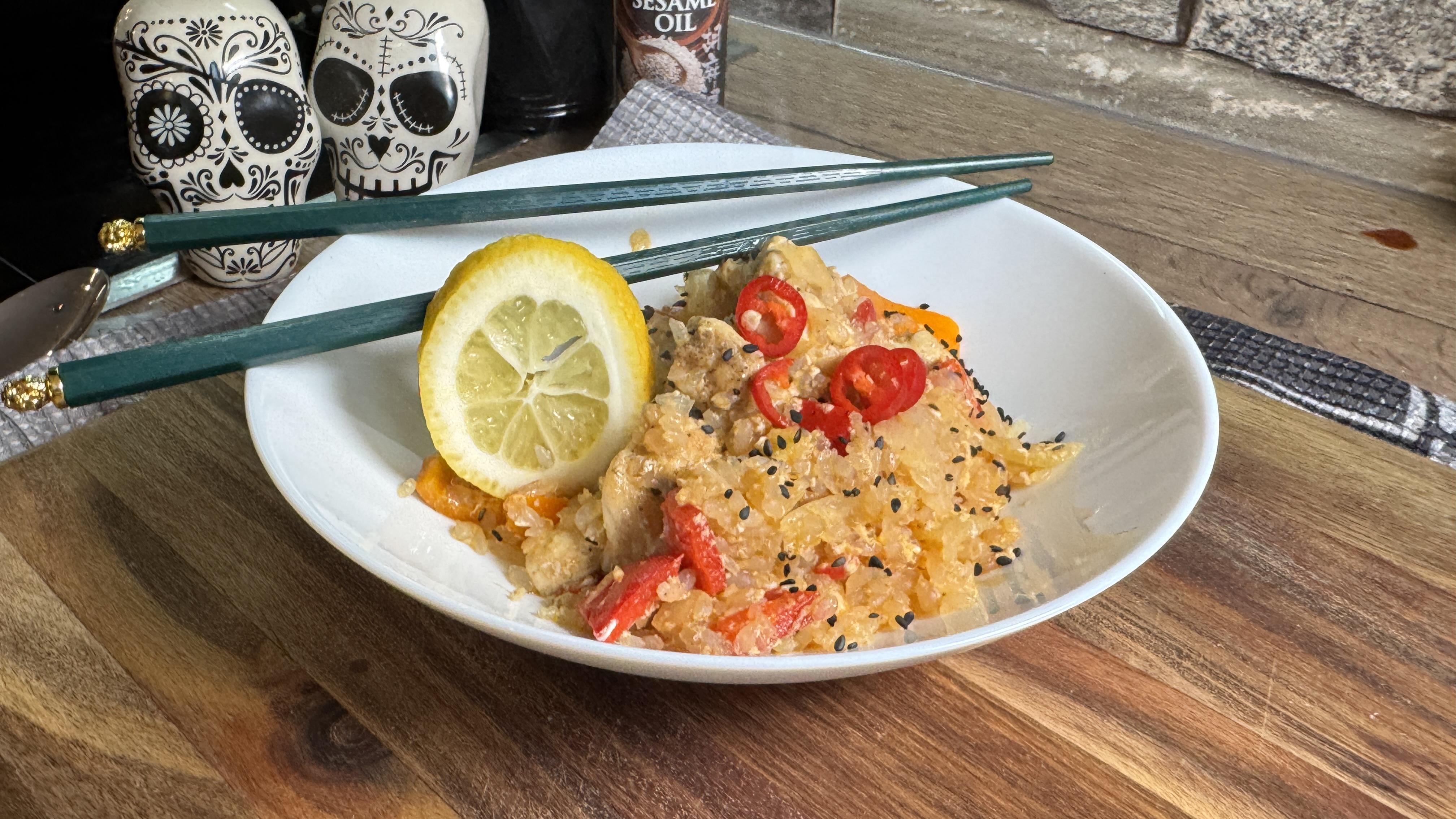 Konjak-Reis ist irgendwie eine geile Erfindung. Er schmeckt nicht wirklich wie echter Reis aber man kann ihn wirklich gut verwenden wenn man Kalorien einsparen will. 100g haben nur 10ckal oder so. Müsst ihr unbedingt mal ausprobieren. 👍