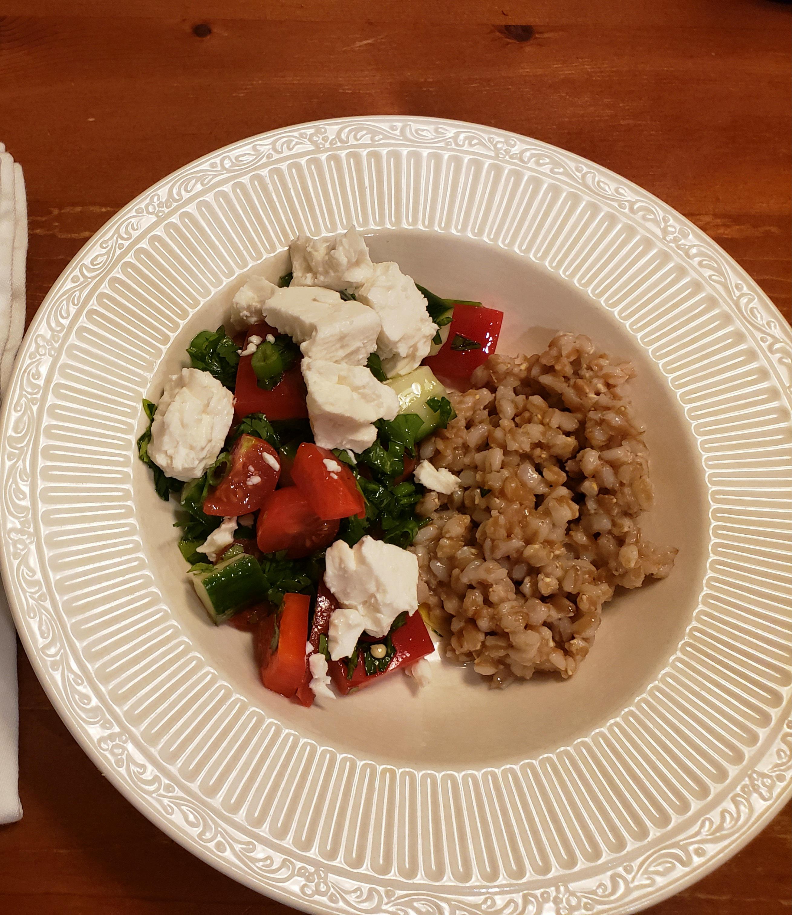 Last night's dinner featured farro – an ancient grain that's new to my kitchen. My husband and I loved it! I made a salad with cucumbers, tomatoes, green onions, red pepper, parsley, and feta, dressed with fresh lemon juice and ev olive oil.