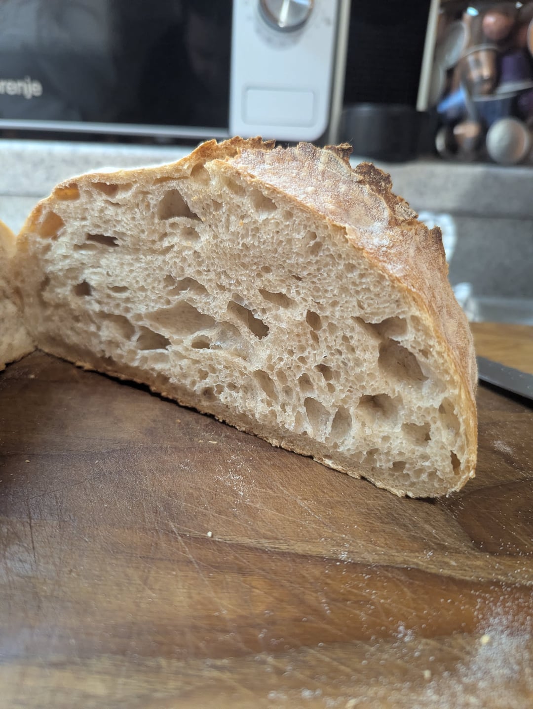 Share Facebook Twitter Pinterest LinkedIn Reddit After a catastrophical failure with my first starter, I've decied to try again. A month later and she came out beautiful! 70% hydration, 24h cold proof, 50% white 50% spelt flour. by Excavator460 4 Comments Purple_Guy7477 1 month ago Bread 🍞🐈 purplishfluffyclouds 1 month ago Yum! GalPavra 1 month ago Perfect! breadmakr 1 month ago That looks beautiful (and tasty)!