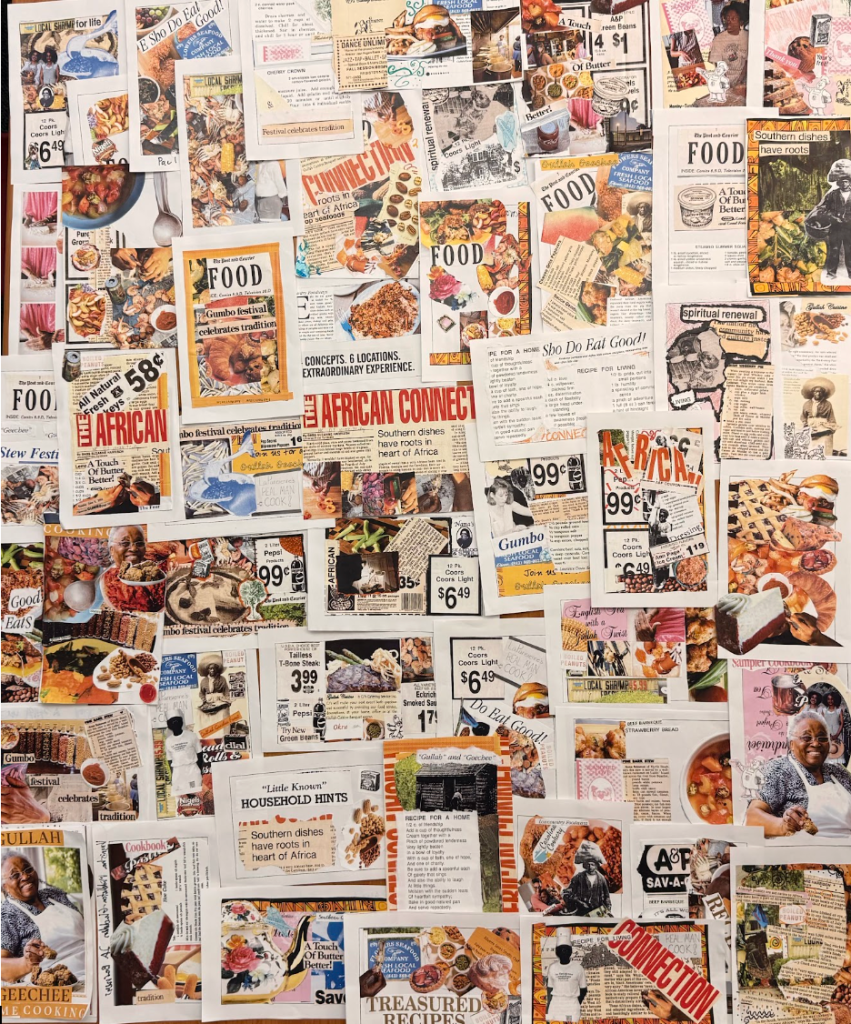 Student-created zines made from collage materials and archival images reflect what students learned about Gullah Geechee foodways and cultural memory (Courtesy of the College of Charleston).