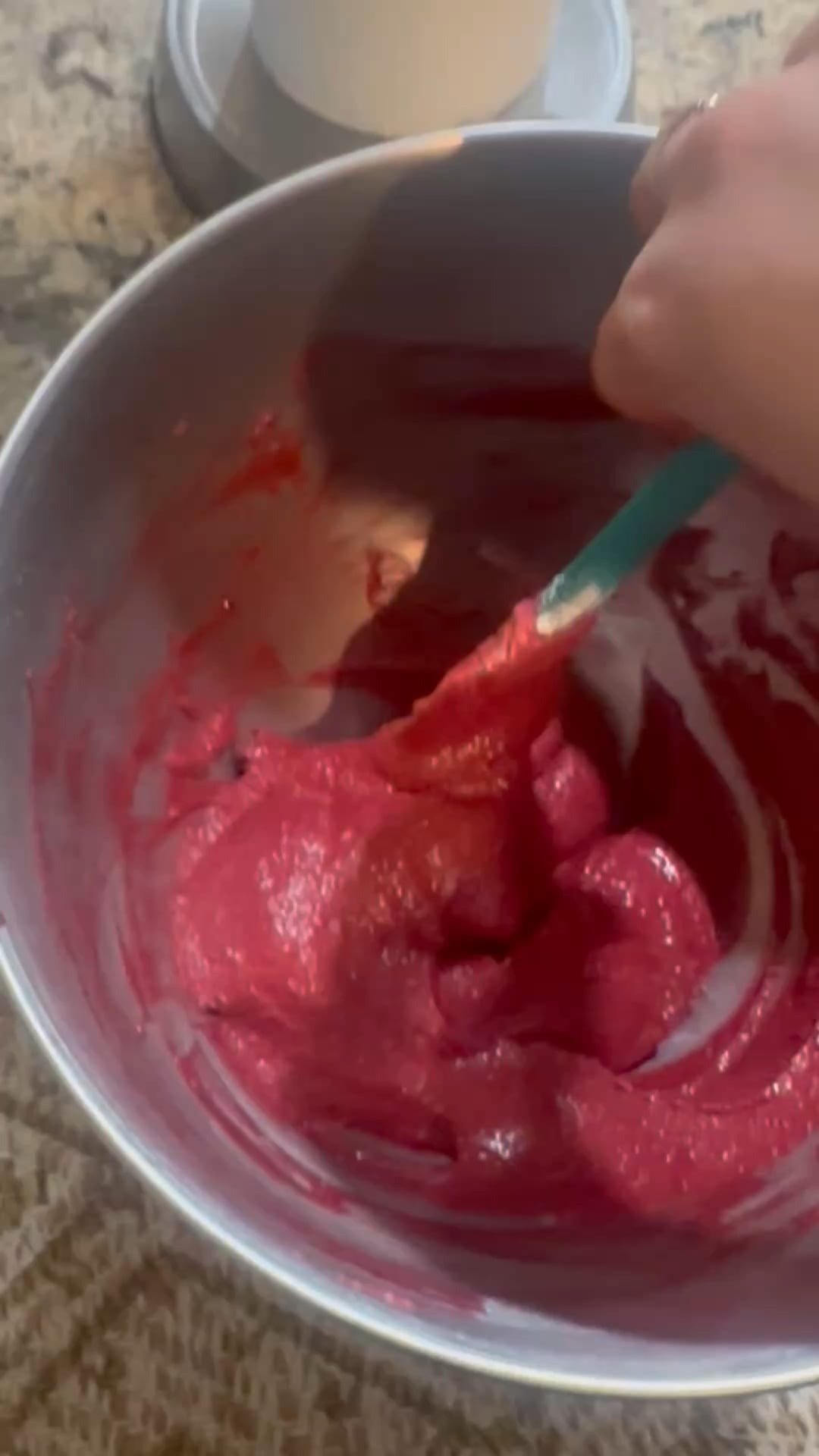 You want it to ribbon. There is also the lava method that I love. Basically you tilt the bowl to the side move all the batter to one side and then put the bowl down flat again. The batter will run down like lava from a volcano (it’s fun!) but if it’s too slow you need to do one to two more stirs. If it’s too fast, you’ve done too much. You want it in the middle. Looking at that I would do 1-3 more mixes.