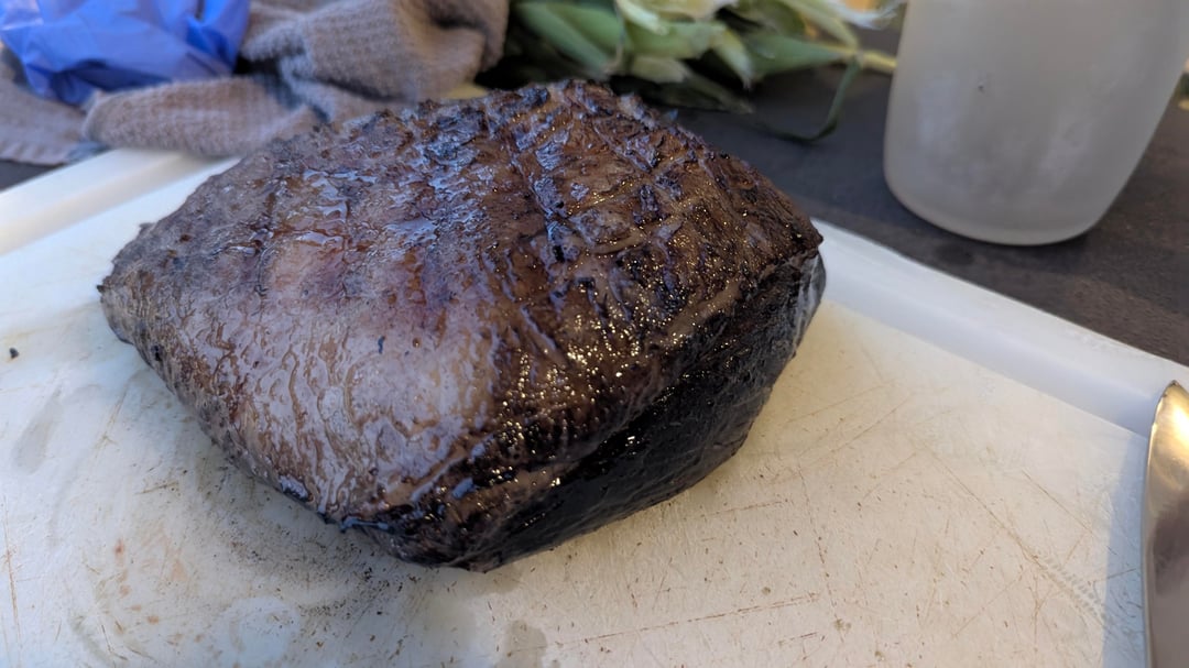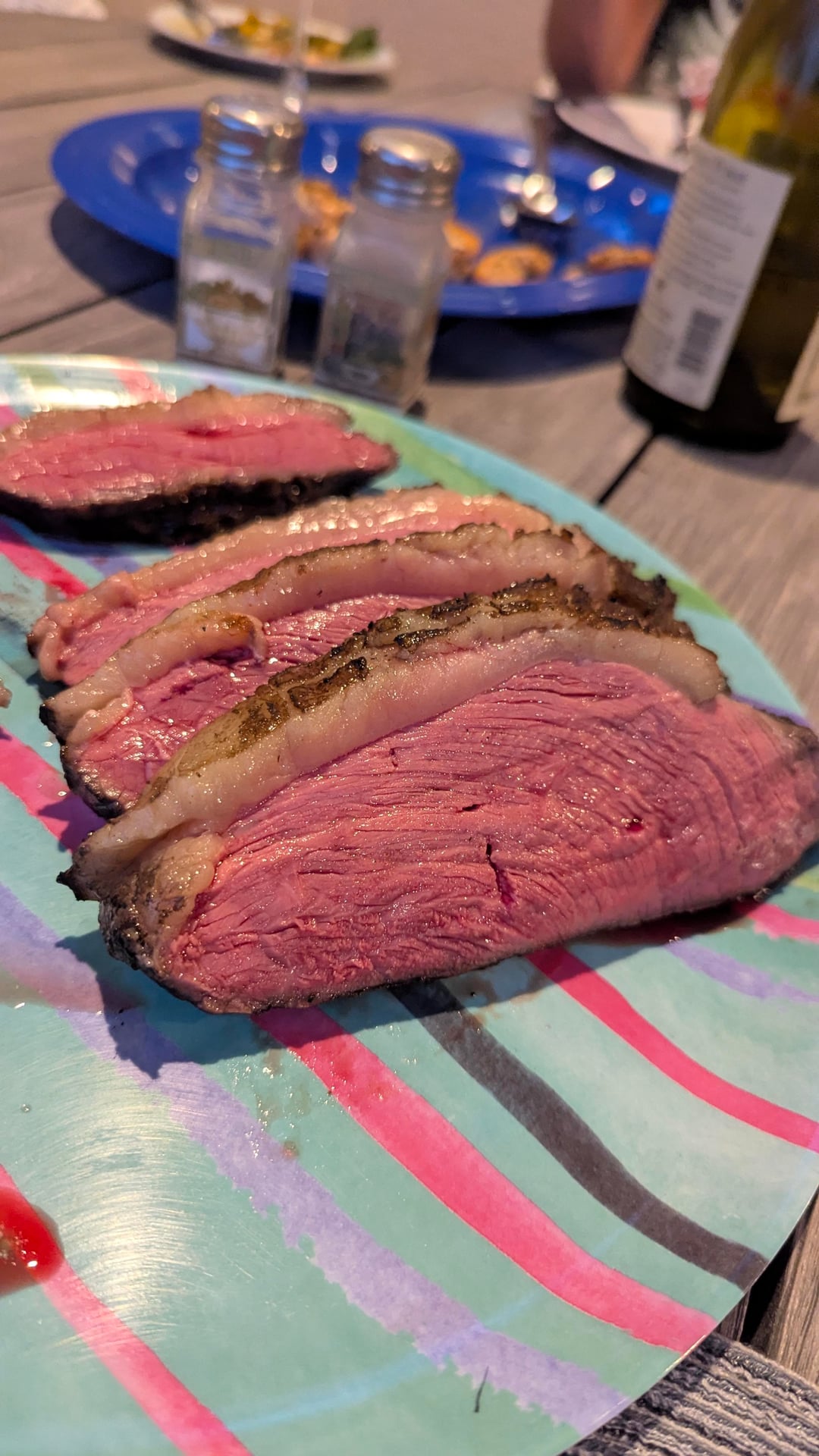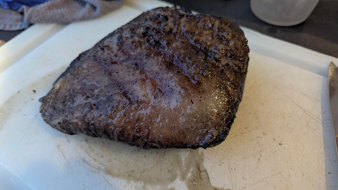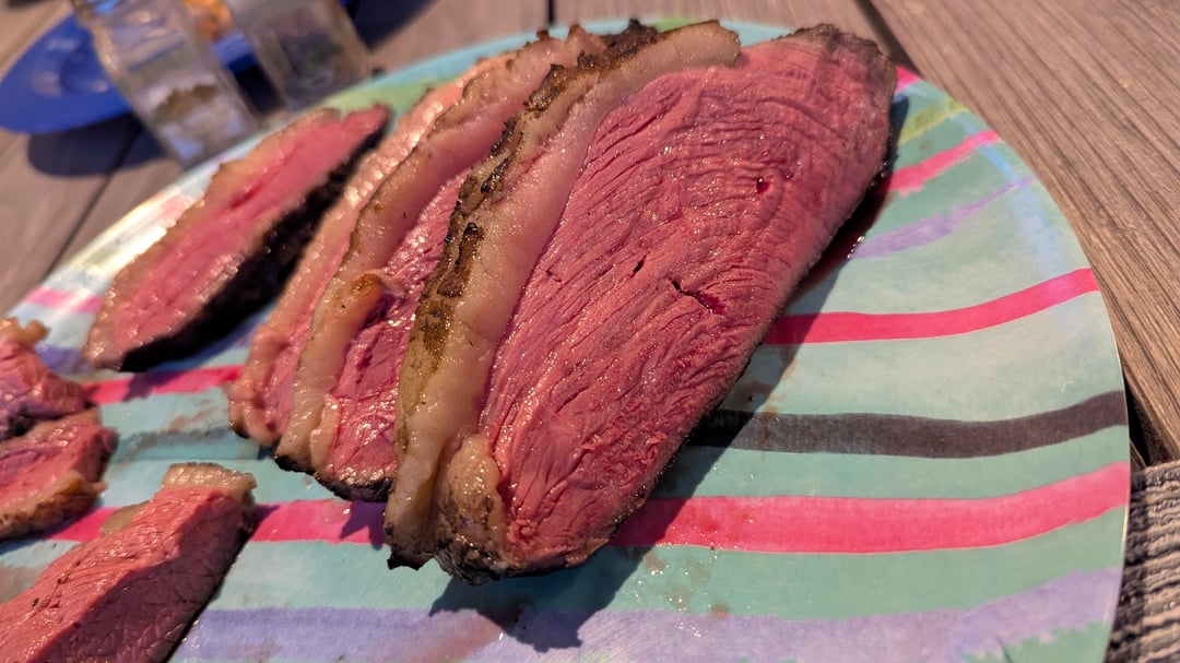One note on the slicing… I may have messed up. The end definitely looks like it was with the grain, but as I got further down it looked like it went against. Like grain curved over the course of the meat. Was still tender enough that it wasn't a problem but I would try going the other way next time to see what happens.