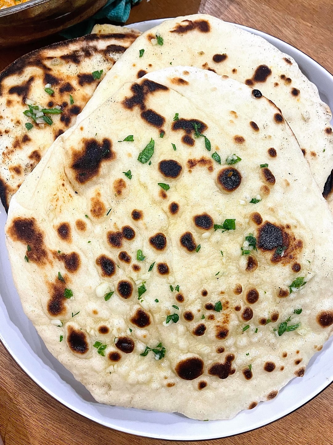 Sauce from a jar- cook chicken pieces in the pan- add sauce- season to taste. Heat up naan in the oven at the same time.