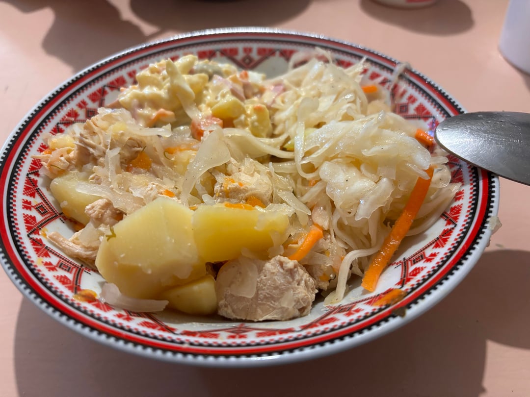 [I ate] Today’s lunch in my military unit somewhere in Ukraine: soup with meat and vegetables (potatoes, paprika, carrots), chicken stew with potatoes, Olivier and cabbage salads