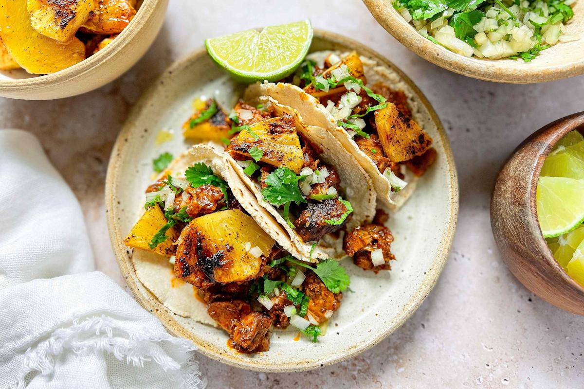 “Tacos al pastor means ‘shepherd-style tacos.’ The influence comes from Lebanese immigrants to Mexico, who brought the shawarma, thinly sliced meat stacked and roasted on a slowly turning vertical spit roast. Shawarma is traditionally prepared with lamb, hence the shepherd reference.” —Susy Villasuso, Recipe Developer