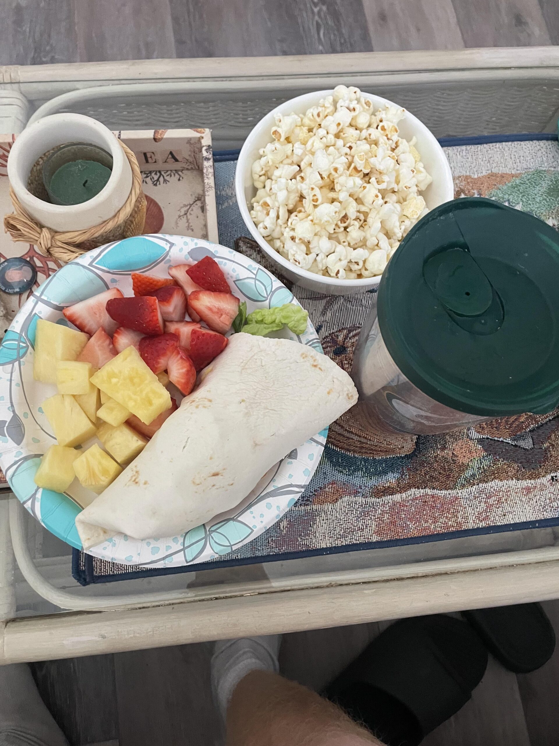 Was in the mood for a wrap so I made a Turkey, mustard, pickle, onion, lettuce wrap with a carb counter tortilla with some sliced strawberries and pineapple and 4 cups of lesser evil popcorn. Also tried out Mott’s new zero sugar apple juice and while I’m a fan of most zero sugar products I was not impressed with this.