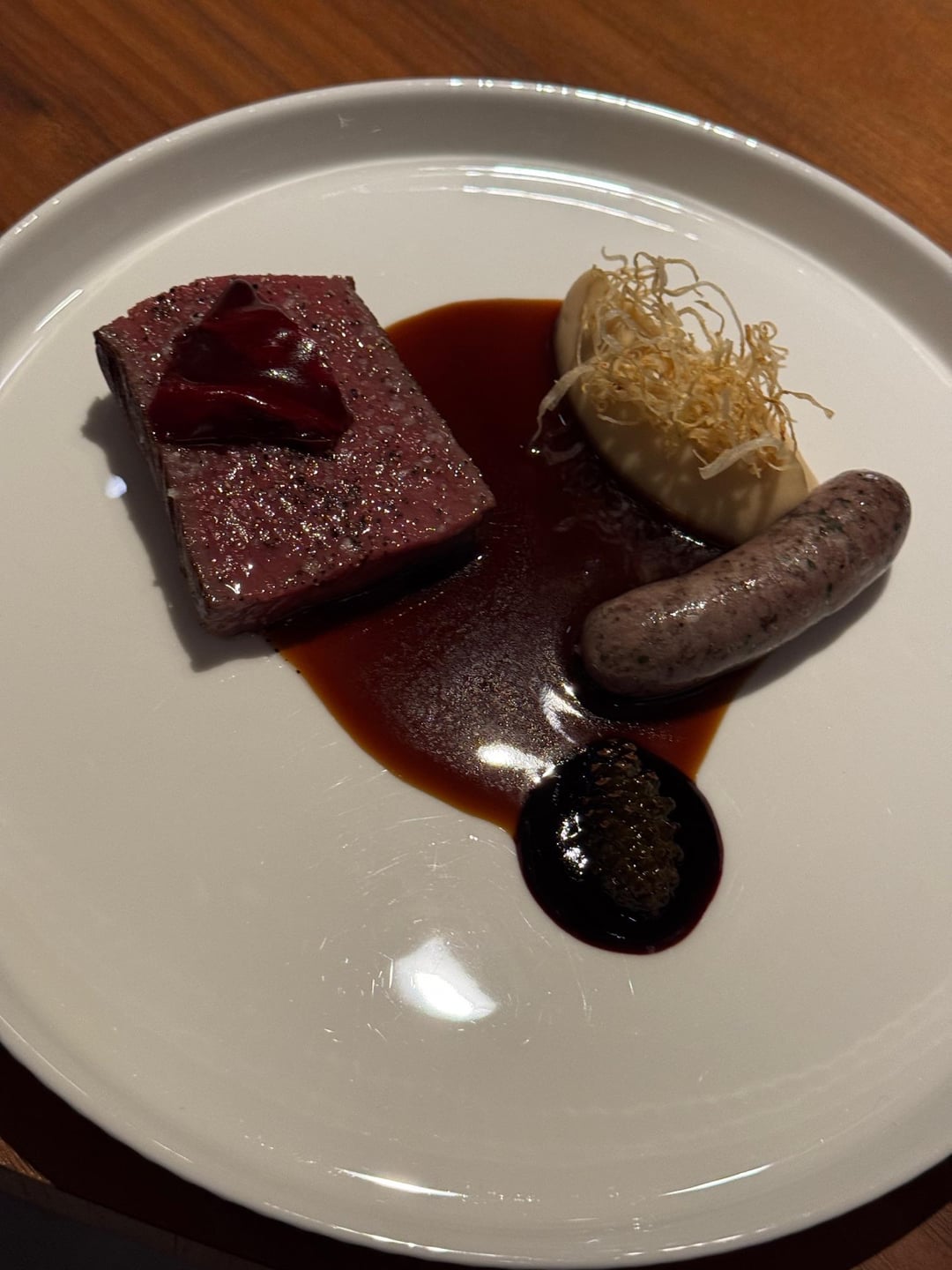Fifth was the fallow deer loin and sausage with celeriac, pine cone, and elderberry pontack was also excellent, though the sausage felt a bit heavy for me. Still, a very well-composed dish overall.