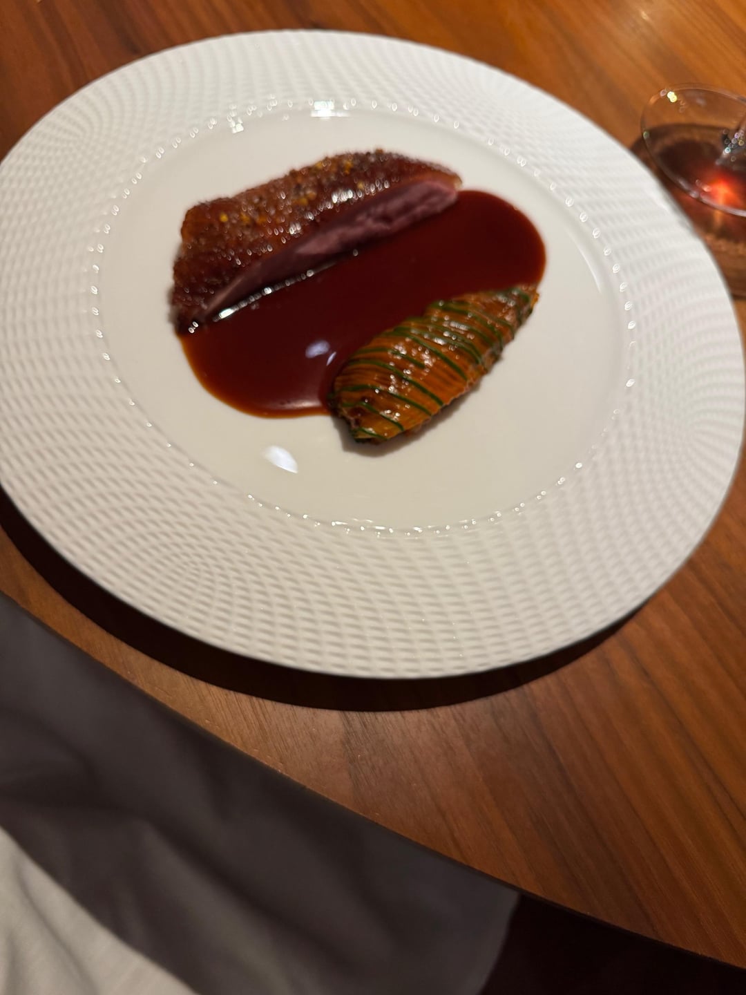 A clear highlight of the evening: honey-roasted duck with cabbage, wild garlic, and jus gras. This might honestly be the best duck breast I’ve ever had. Tender meat and very well prepared.