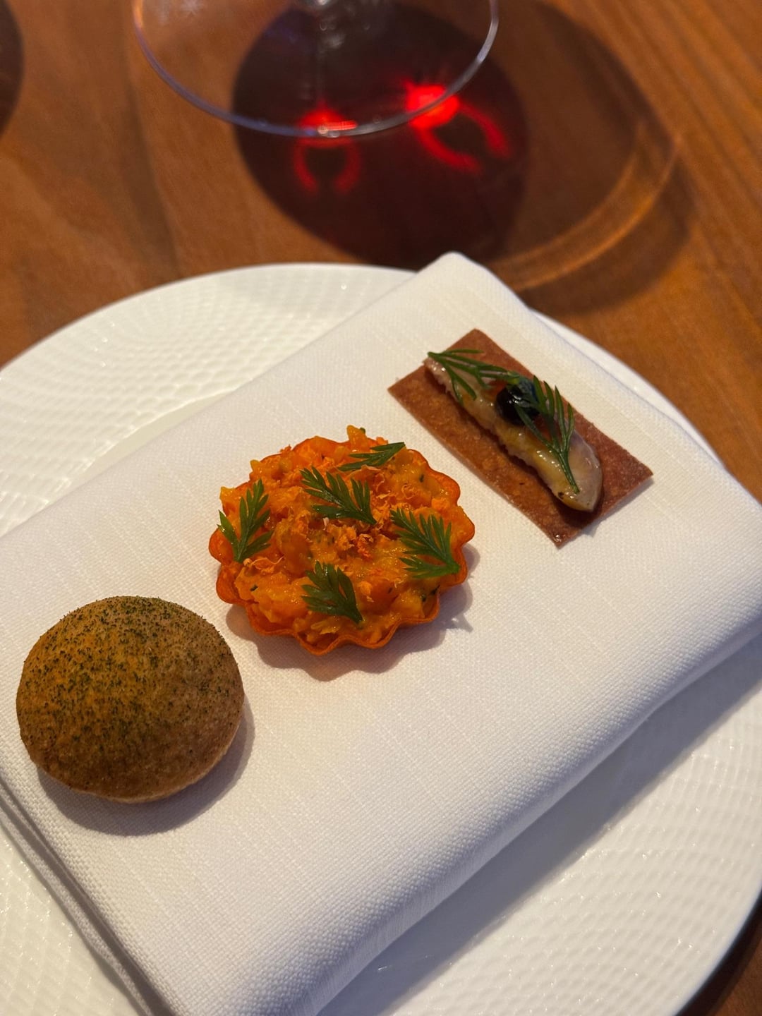 We started with three amuse-bouches. All were great, but the standout for me was the vegetable broth (sadly no photo) and an “olomoucké syrečky” muffin—both packed with full and tasty flavor.