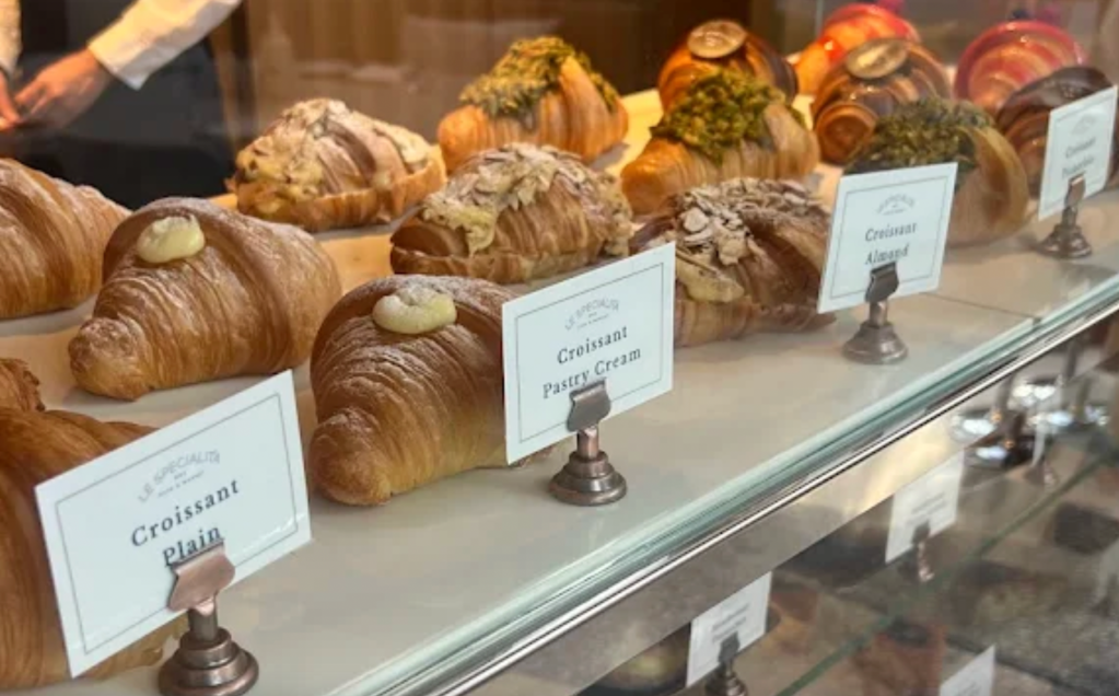 At the entrance, a glass display showcases pastries and croissants