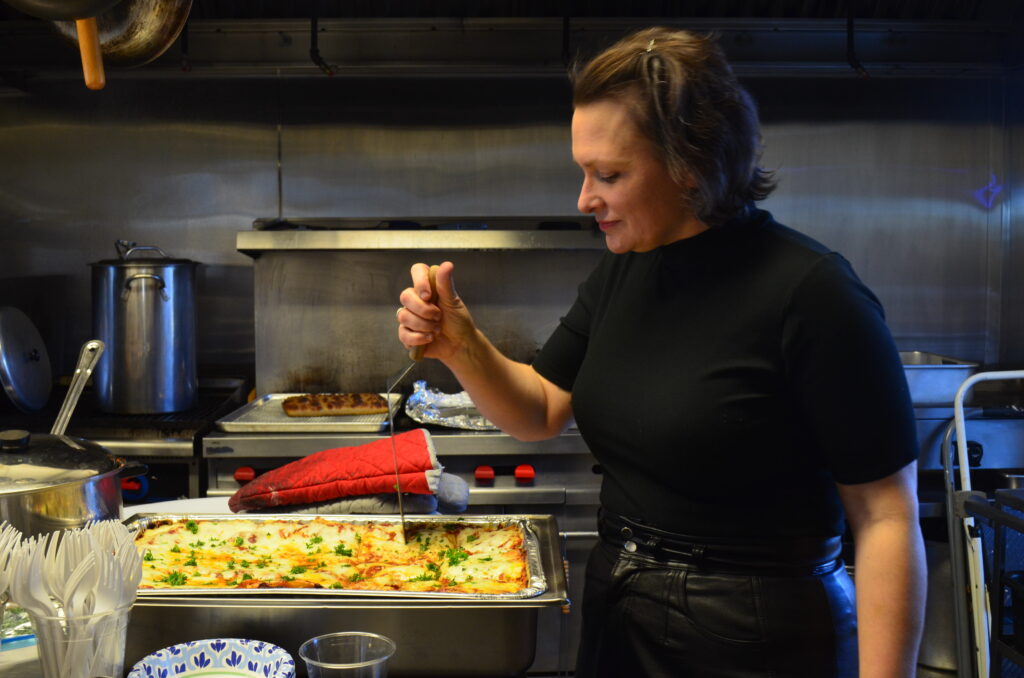 Wilhelmi serving lasagna at a community dinner in March in Evanston. | Alessia Girardin/The Record North Shore