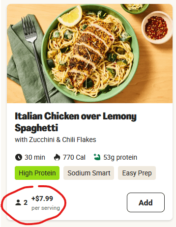 Doesn’t this mean you are currently paying for 2 servings, but if you want to add on for more people it will cost an extra $7.99 per additional serving.