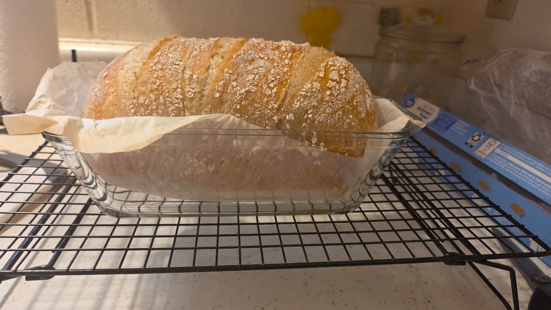 it fell out of the bowl ny itself beautifully, stretched it out into a rectangle, did a tri fold and rolled it up and tightened the dough using the push and pull method. rested for another 30 minutes then repeated shaping, and placed in my bannaton smooth side down. waiting 5 min then stitched the bottom and sprinkled rice flour, covered it with plastic wrap and kept it in the fridge for 8 hours. I put it directly from the fridge to my preheated oven, I currently only have a bread pan so I baked it in there with parchment paper. I put an ice cube underneath and a lid for the bread pan.