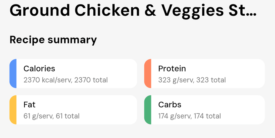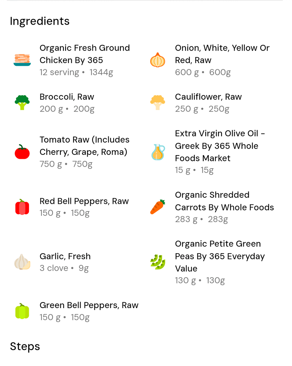 Ingredients in the photos. I get 4 portions out of the amounts mentioned, but YMMV.