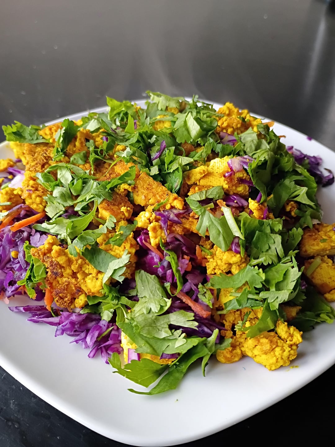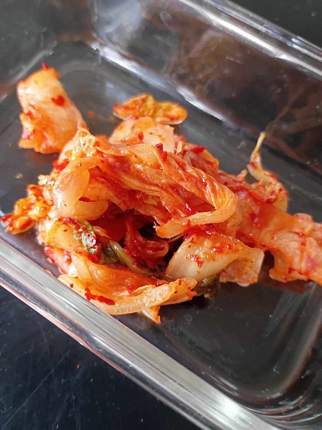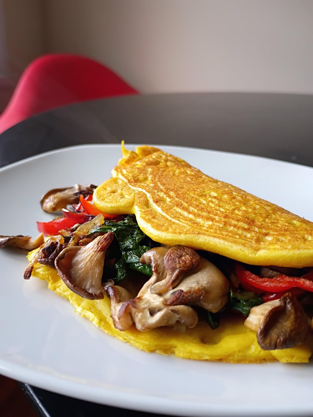 3. Chickpea omelet with mushrooms, spinach, and red bell pepper. Kimchi on the side