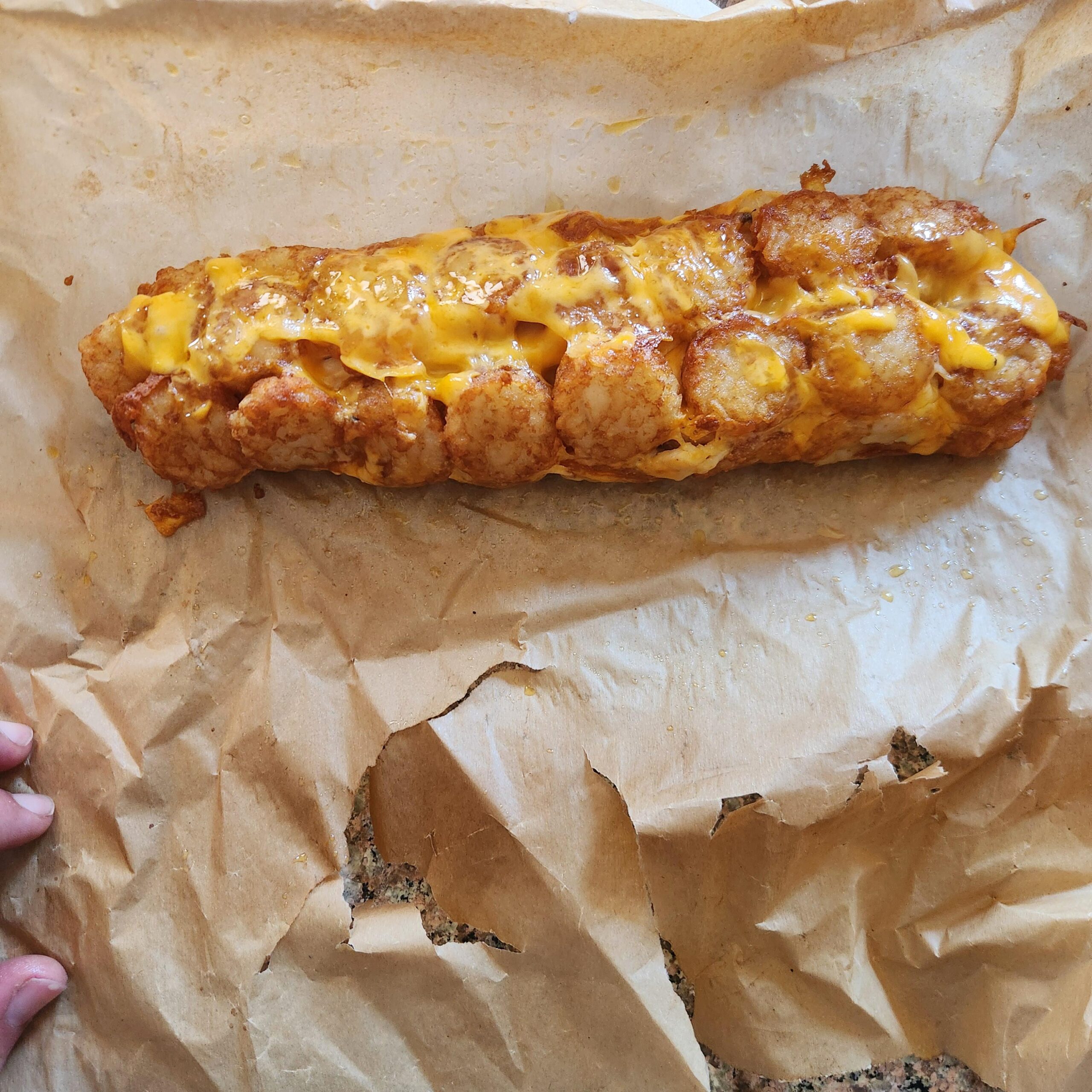 I don’t understand what I’m seeing here … A cheesey tater tot log? 🪵 I bet it tastes like regret and sadness