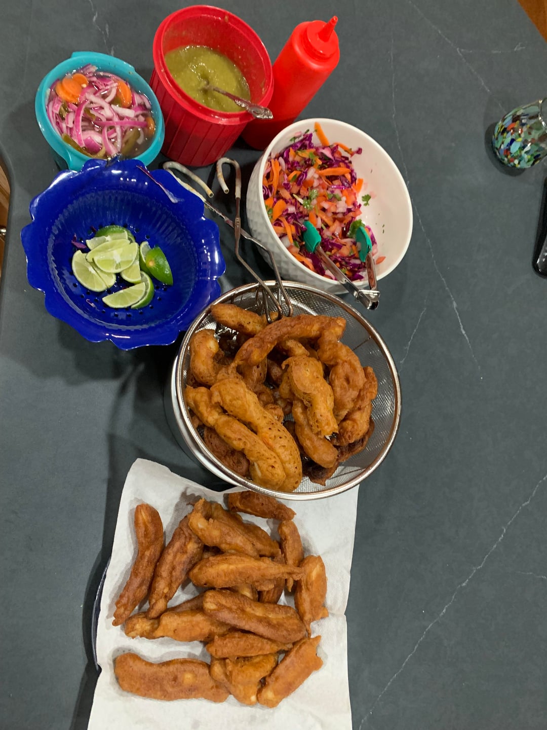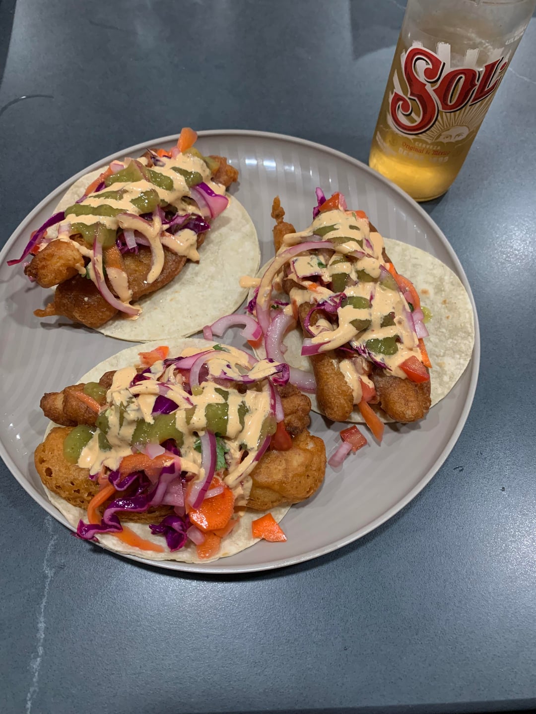 Wife made pescado y camarón empanizado with her own beer batter, salsa verde, cebollas curtidos, cabbage and carrots seasoned with lime, and chipotle mayo… 10/10! by dochliday Dining and Cooking